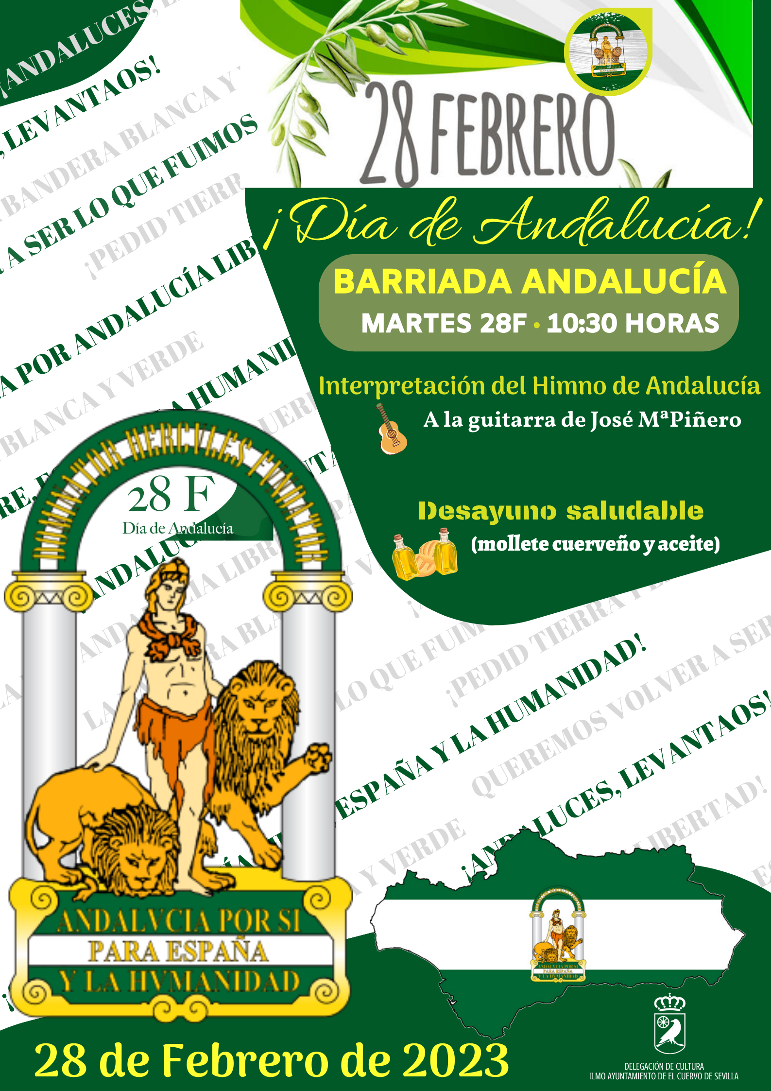 La Delegación de Cultura organiza el martes 28 febrero, Día de Andalucía, un acto institucional para conmemorar el Aniversario del Referéndum de Autonomía. Durante el acto se hará entrega a los presentes de banderas de Andalucía y el artista cuerveño José María Piñero interpretará el Himno de Andalucía a la guitarra.
