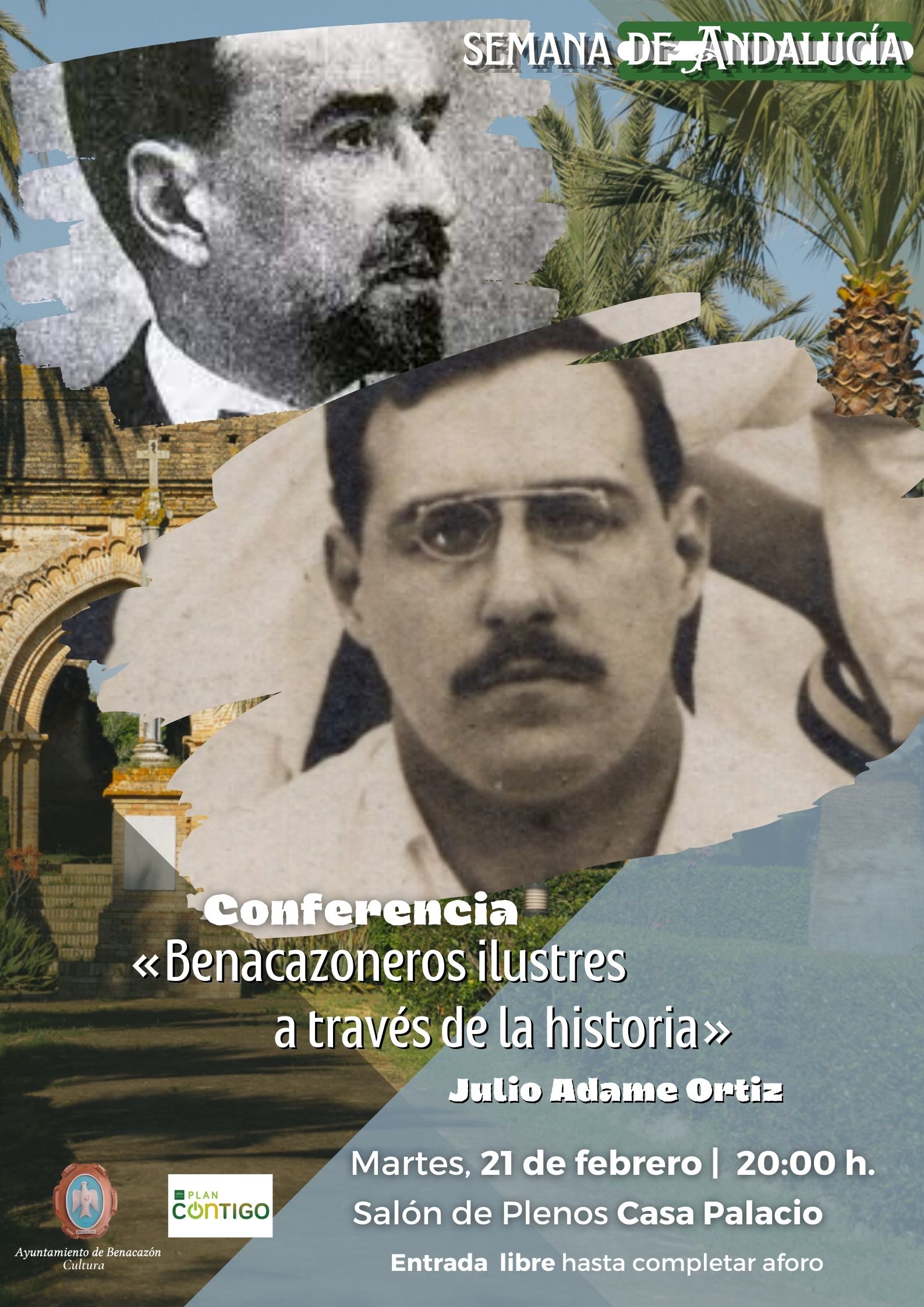 El Ayuntamiento de Benacazón informa sobre la CONFERENCIA "BENACAZONEROS ILUSTRES A TRAVÉS DE LA HISTORIA", a cargo del Animador Turístico del Plan Contigo Julio Adame Ortiz, que tendrá lugar el Martes 21 de Febrero a las 8 de la tarde en el Salón de Plenos de la Casa Palacio (C/Real, 24. 1ª planta), organizado por la Delegación de Cultura -dentro de las actividades organizadas con motivo de la Semana de Andalucía-, con Entrada Libre, hasta completar aforo.