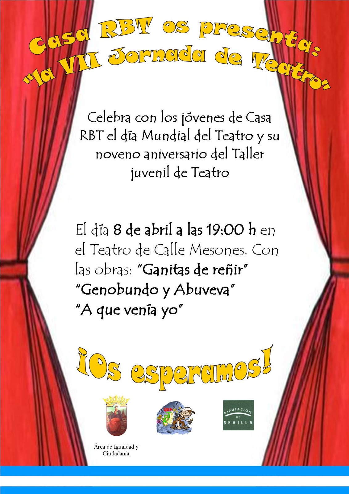 El "Taller de Teatro Juvenil" de Casa RBT del Área de Igualdad del Ayuntamiento de Constantina os invita a la VII Jornada de Teatro y su noveno aniversario como alumnos de este taller.