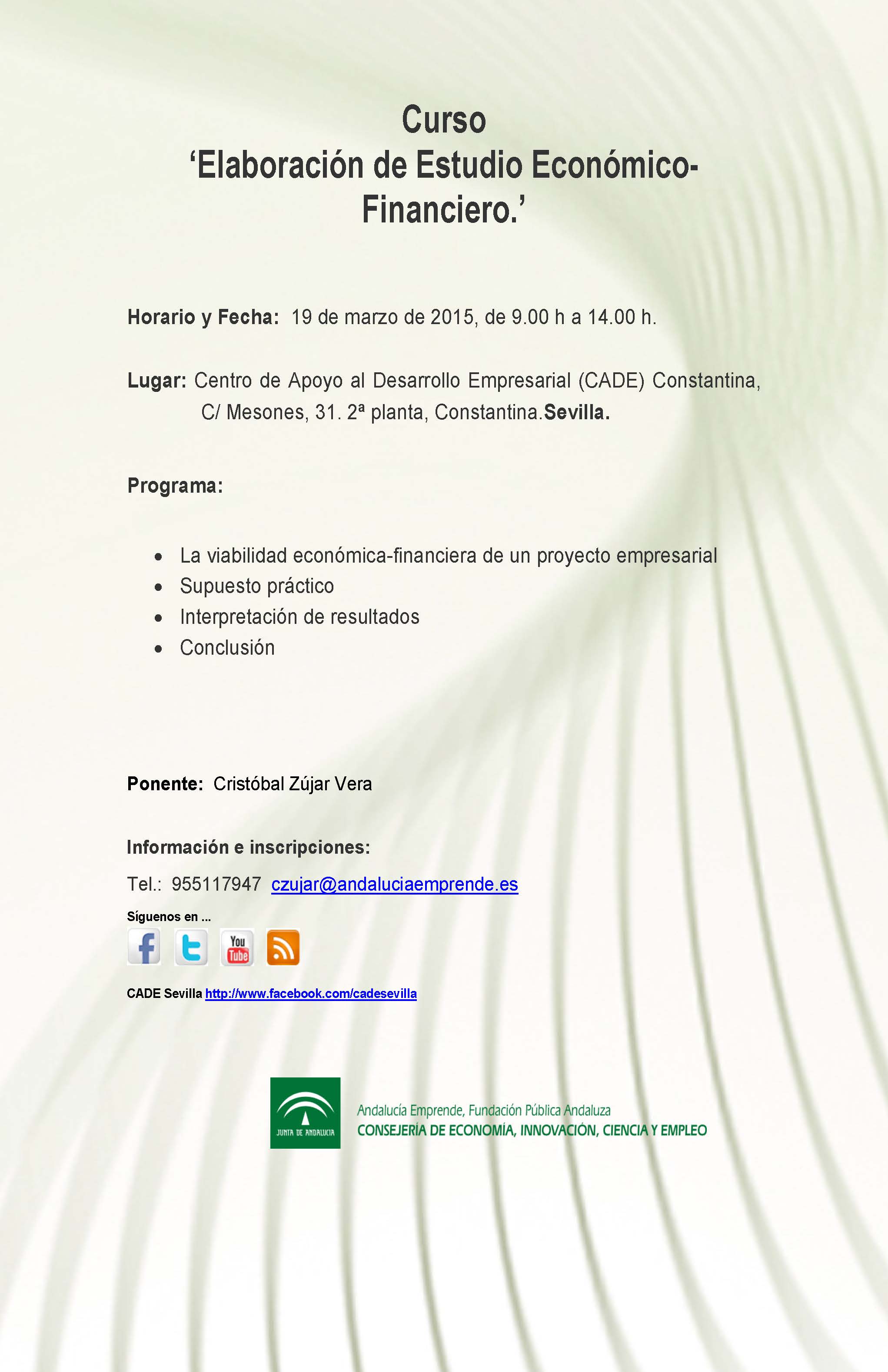 Si estás interesado en recibir más información puedes inscribirte gratuitamente en: 955 11 79 47 o czujar@andaluciaemprende.es