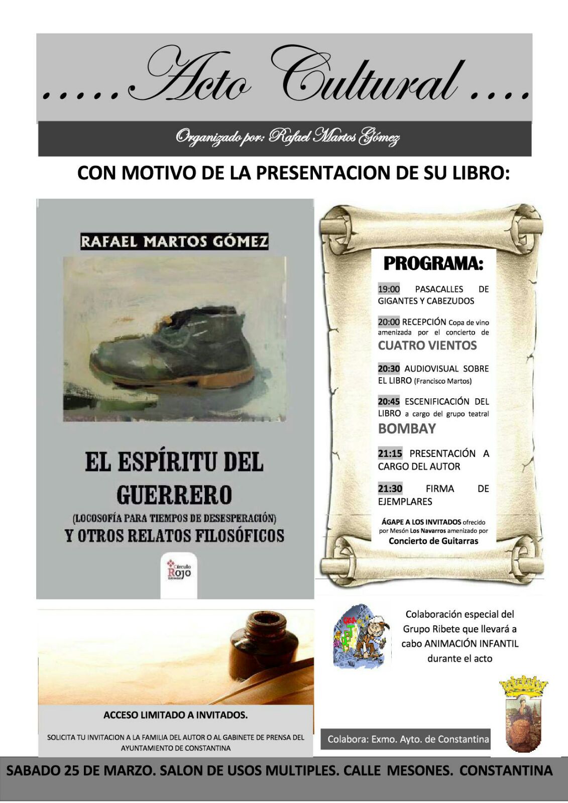 El próximo sábado 25 de marzo, nuestro paisano Rafael Martos Gómez, organiza todo un completo programa de actividades culturales, que comenzarán a las 19:00 horas, en el Centro de Usos Múltiples, en torno a la presentación oficial de su libro "El espíritu del guerrero" que incluirá pasacalles de gigantes y cabezudos, concierto, audiovisual, teatro y animación infantil, todo como preámbulo a la presentación y firma de ejemplares por parte del autor.