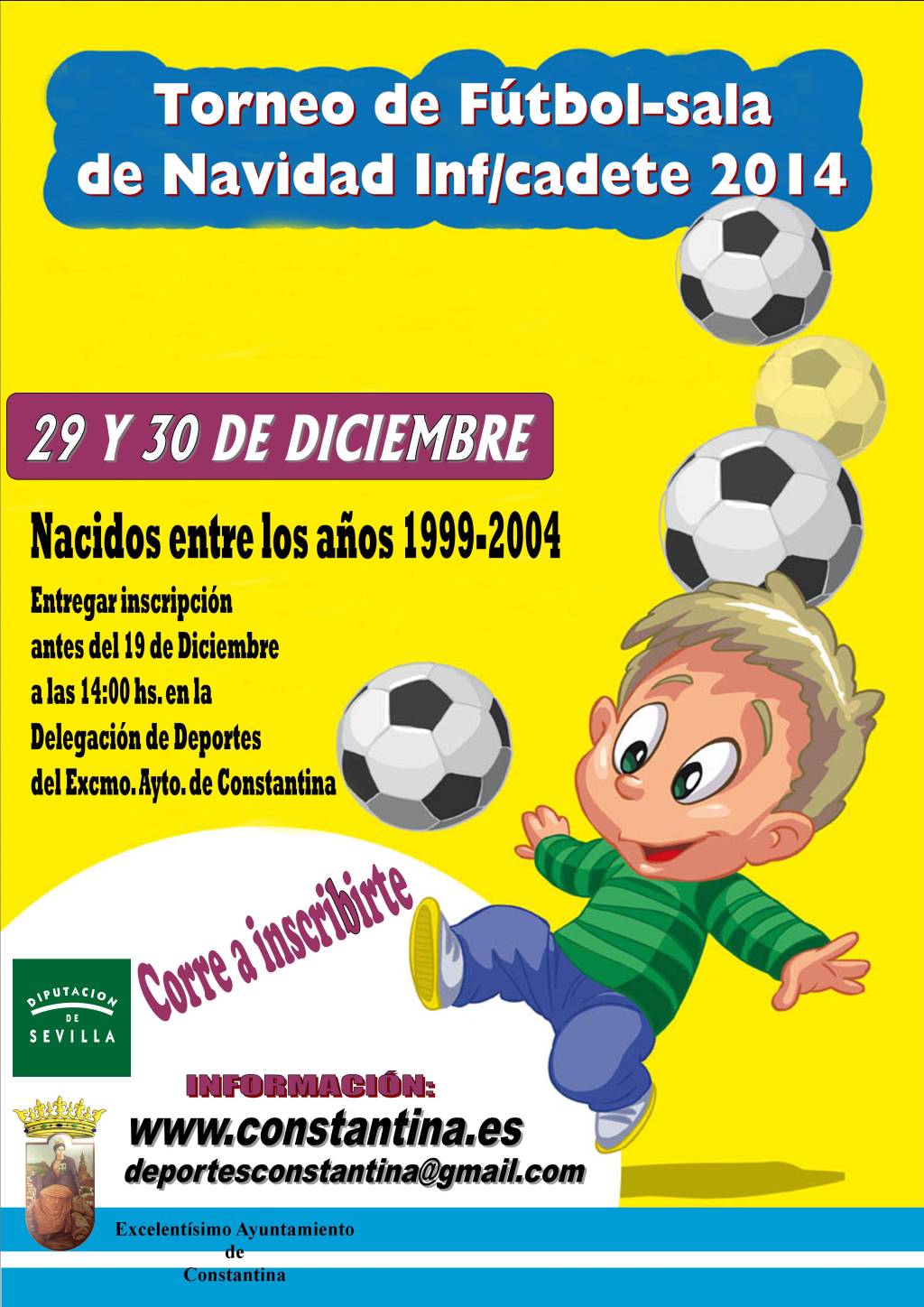 TORNEO DE FÚTBOL-SALA INFANTIL-CADETE 29-30 diciembrePolideportivo Municipal "La Laguna" Inscripción hasta el viernes 19 de diciembre, en la Delegación de Deportes del Excelentísimo Ayuntamiento de Constantina donde os facilitarán información sobre las normas de participación. Años de nacimiento: 1999/2004