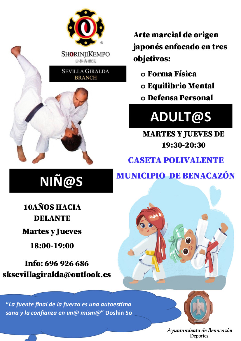 El Ayuntamiento de Benacazón informa sobre la puesta en marcha, por parte de la Delegación de Deportes, del "Taller de SHORINJIKEMPO", para adult@s y niñ@s a partir de 10 años, que se va a desarrollar en la Caseta Polivalente del Parque Municipal.