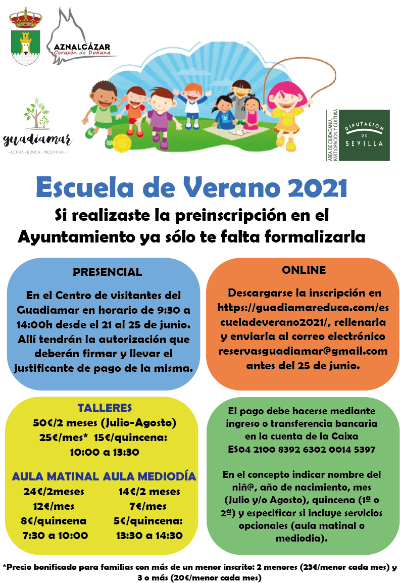 La empresa Guadiamar Educa será la encargada de la puesta en marcha de la Escuela de Verano 2021. Las personas que presentaron la preinscripción dentro del plazo, sólo tienen que formalizar la matrícula con la empresa. Las presentadas fuera de plazo, pasarán a lista de espera y serán avisadas según disponibilidad de plazas.
