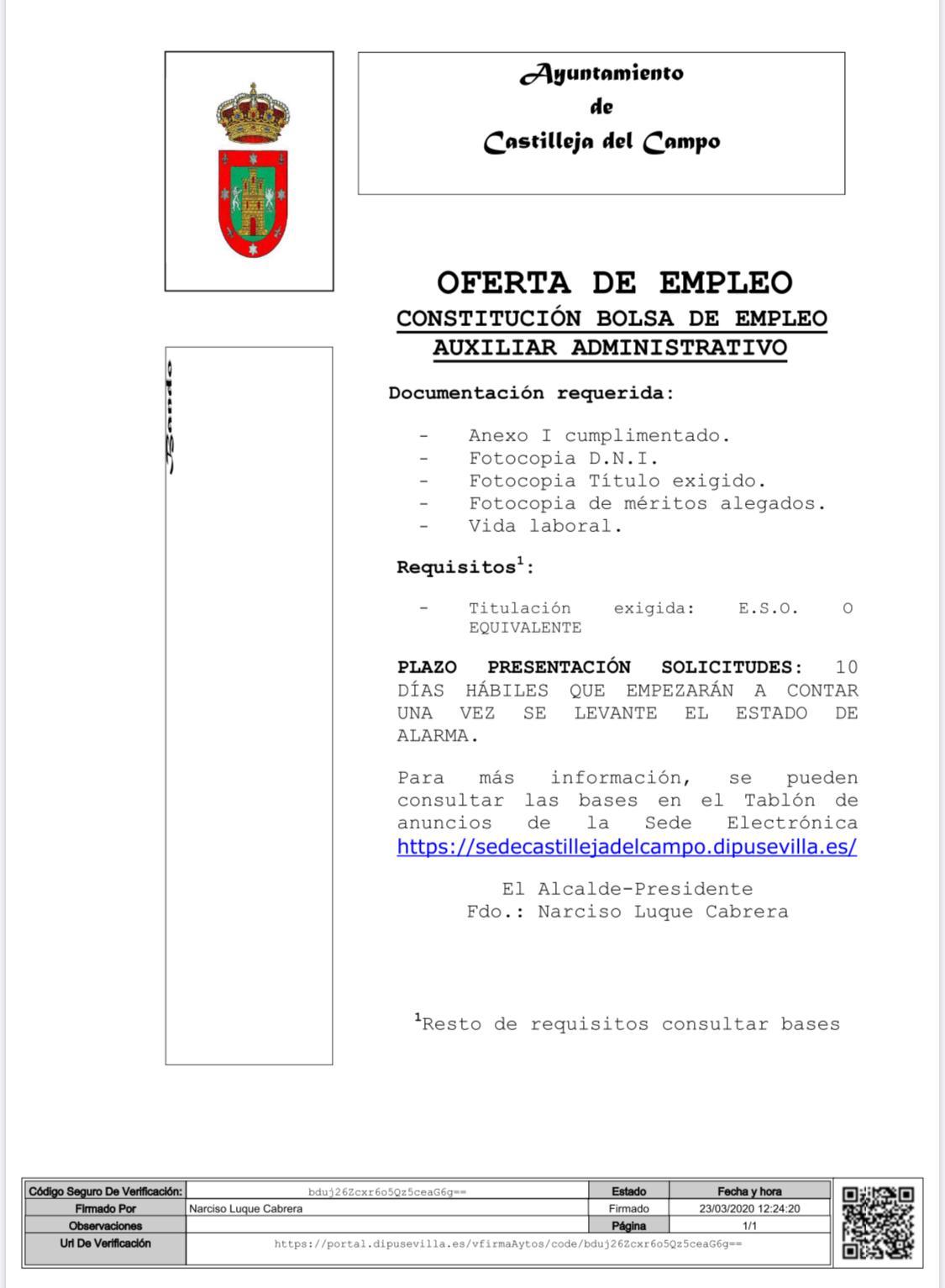 Imagen Ubicación Categoría noticia Empleo Mostrar en el carrusel de la sección No Fecha Lun, 02/03/2020 - 14:00 Más información http://www.castillejadelcampo.es/es/actualidad/noticias/Oferta-de-Empleo-Auxili…