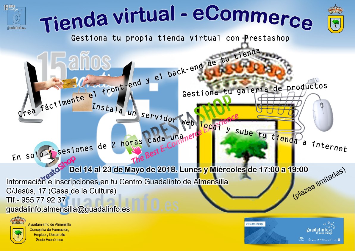 Del 14 al 23 de mayo , los lunes y miércoles en horario de 17:00 a 19:00, pondremos en funcionamiento el curso sobre tiendas virtuales y eCommerce para crear, fácilmente, tu tienda en internet.