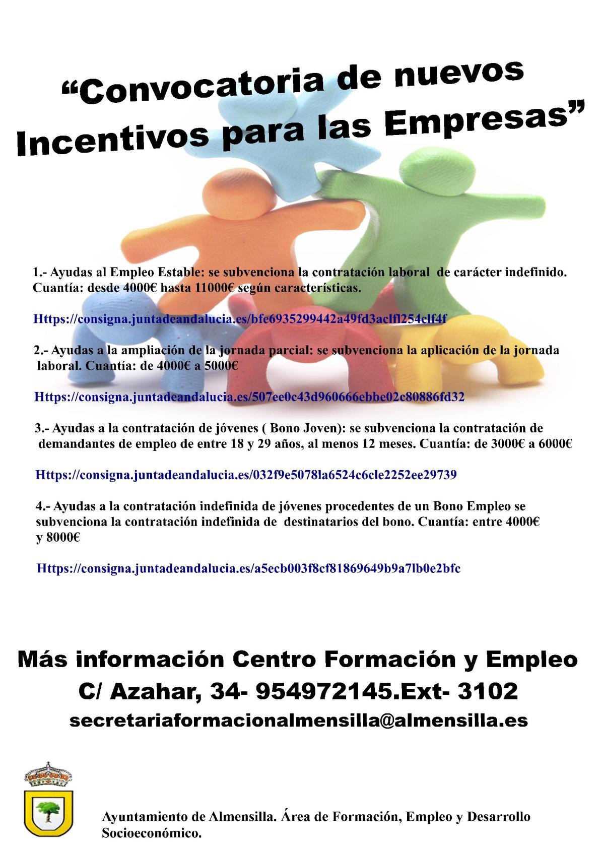 La Junta de Andalucía ha abierto el plazo de la Convocatoria de nuevos Incentivos para las Empresas: ayudas al empleo Estable, ayudas a la ampliación de la jornada laboral parcial, ayudas a la contratación de jóvenes (Bono Empleo) y ayudas a la contratación indefinida de jóvenes procedentes de un Bono Empleo.
