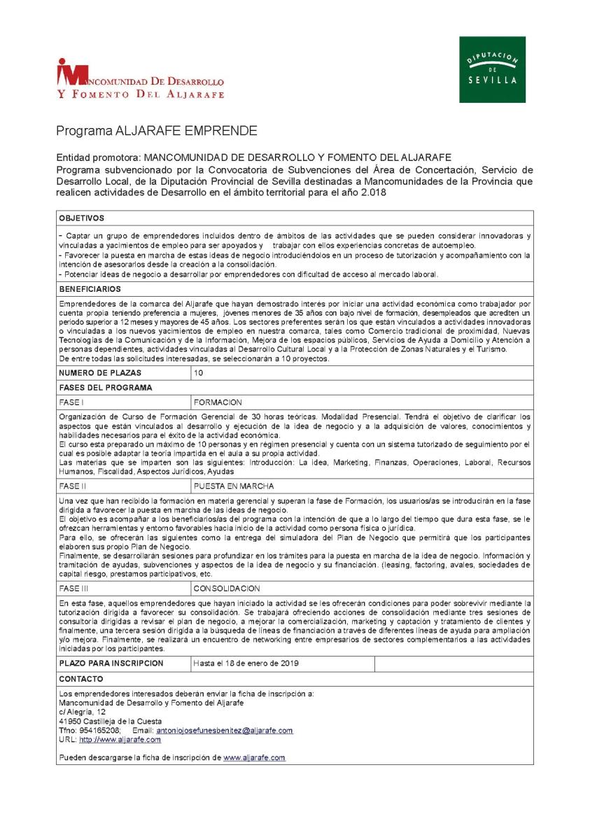 Informamos de un nuevo programa que pone en marcha la Mancomunidad de Desarrollo y Fomento del Aljarafe denominado Aljarafe Emprende.