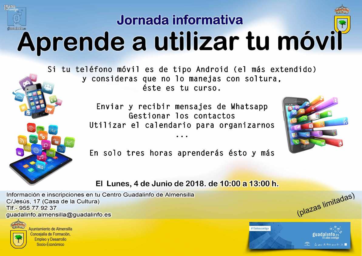 El próximo lunes 4 de junio desde el Aula Guadalinfo se impartirá la jornada informativa 'Aprende a utilizar tu móvil', será de 10h a 13h.