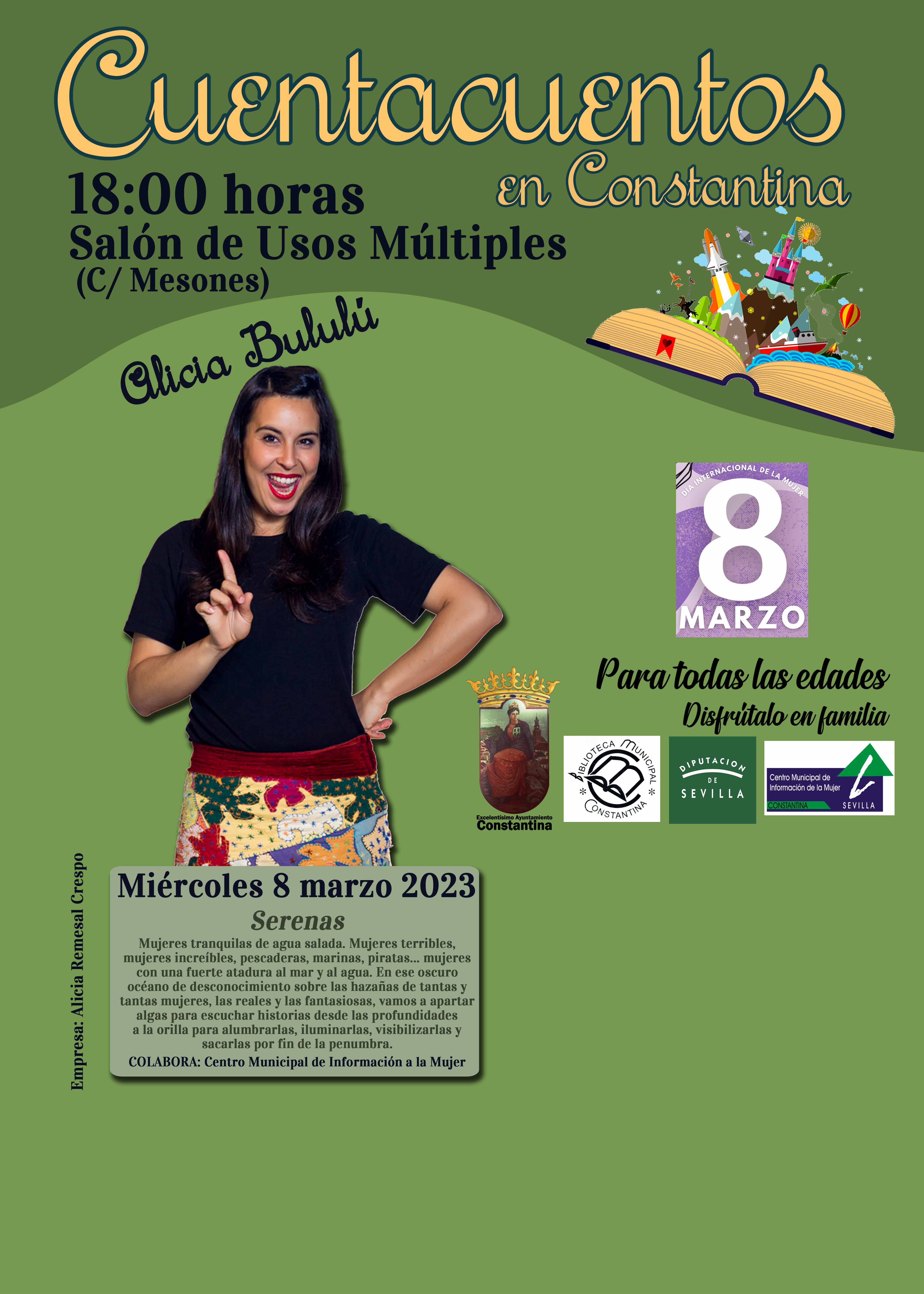 Miércoles 8 de marzo 2023, a las 18:00 horas en el Salón de Usos Múltiples: CUENTACUENTOS INFANTIL SERENAS a cargo de ALICIA BULULÚ: Mujeres tranquilas de agua salada. Mujeres terribles, mujeres increíbles, pescaderas, marinas, piratas... mujeres con una fuerte atadura al mar y al agua. En ese oscuro océano de desconocimiento sobre las hazañas de tantas y tantas mujeres, las reales y las fantasiosas, vamos a apartar algas para escuchar historias desde las profundidades a la orilla para alumbrarlas, iluminarlas, visibilizarlas y sacarlas por fin de la penumbra.