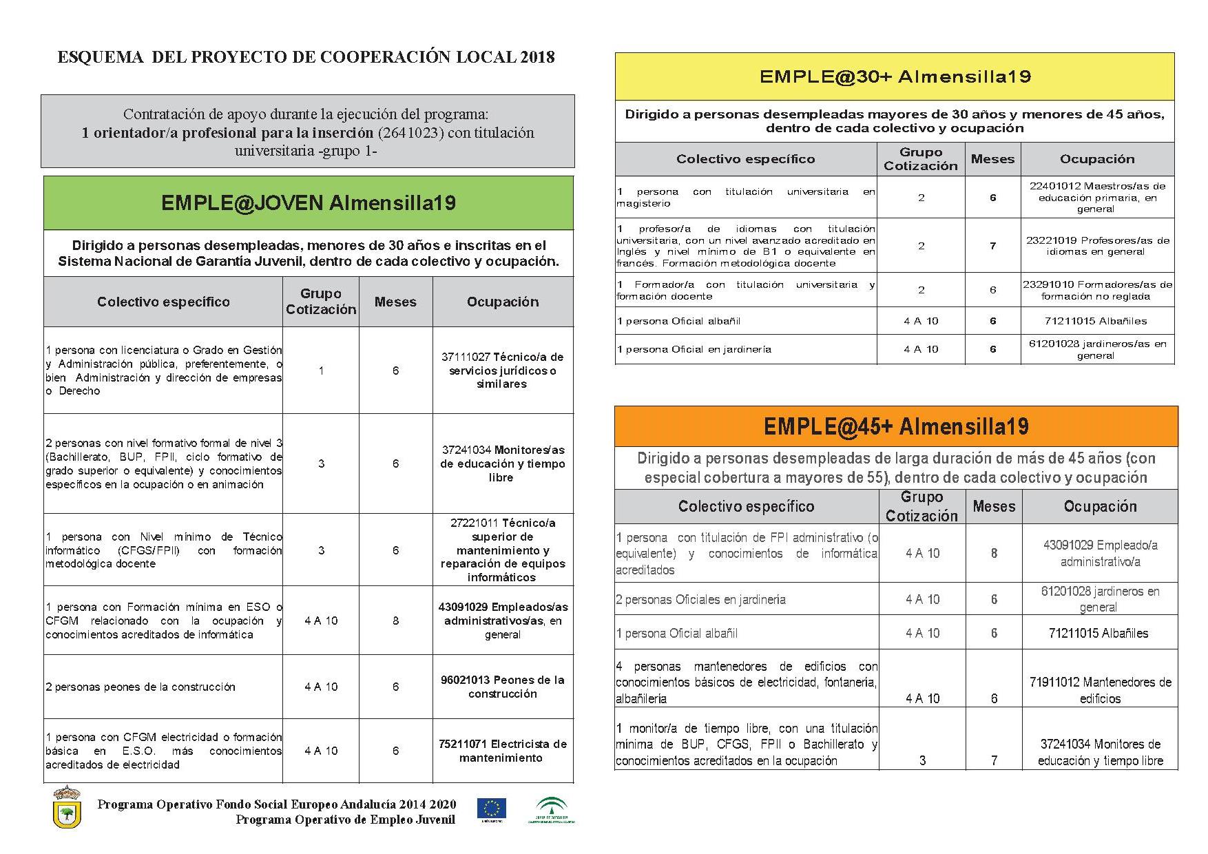El Ayuntamiento de Almensilla ha recibido Resolución positiva de la Delegación Territorial de Conocimiento y Empleo de Sevilla para su proyecto de cooperación local, a través del cual podrá contratar a 23 trabajadores/as en diferentes ocupaciones y atendiendo a determinados requisitos y rangos de edad que aparecen en la tabla adjunta. Esta iniciativa está subvencionada por la Junta de Andalucía, la Administración General del Estado y el Fondo Social Europeo con el Programa Operativo de Empleo Juvenil y el Programa Operativo Andalucía FSE 2014-2020.
