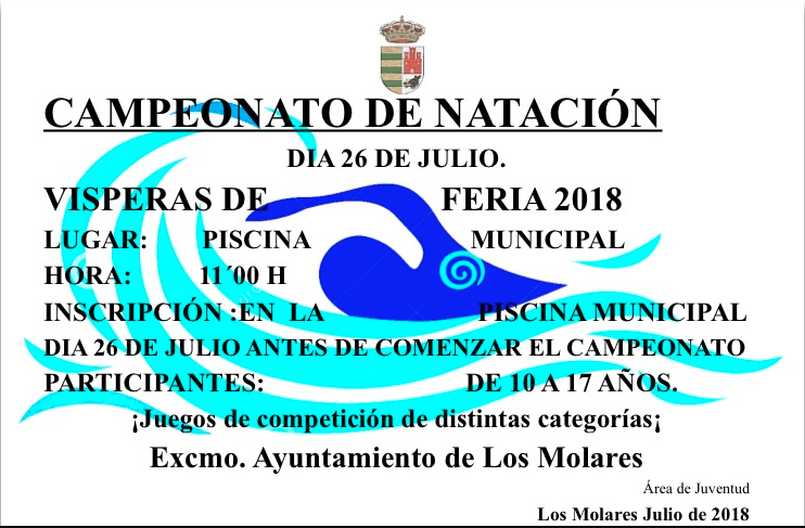 Imagen Ubicación Categoría noticia Deporte Mostrar en el carrusel de la sección No Fecha Mié, 18/07/2018 - 10:54 Más información http://www.losmolares.es/es/actualidad/noticias/CAMPEONATO-DE-NATACION-2018/