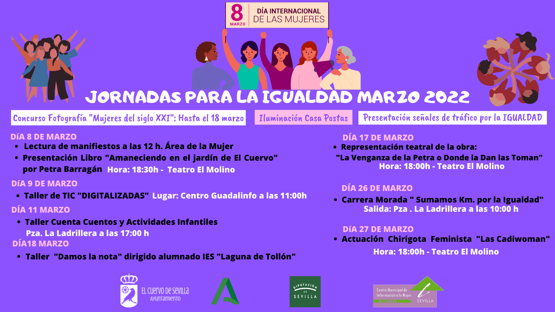 La actividad central se desarrollará el día 8 de marzo con la lectura de manifiestos a las 12 h. en el área de la Mujer y la presentación del Libro "Amaneciendo en el jardín de El Cuervo" por Petra Barragán en el Teatro El Molino a las 18:30 horas.