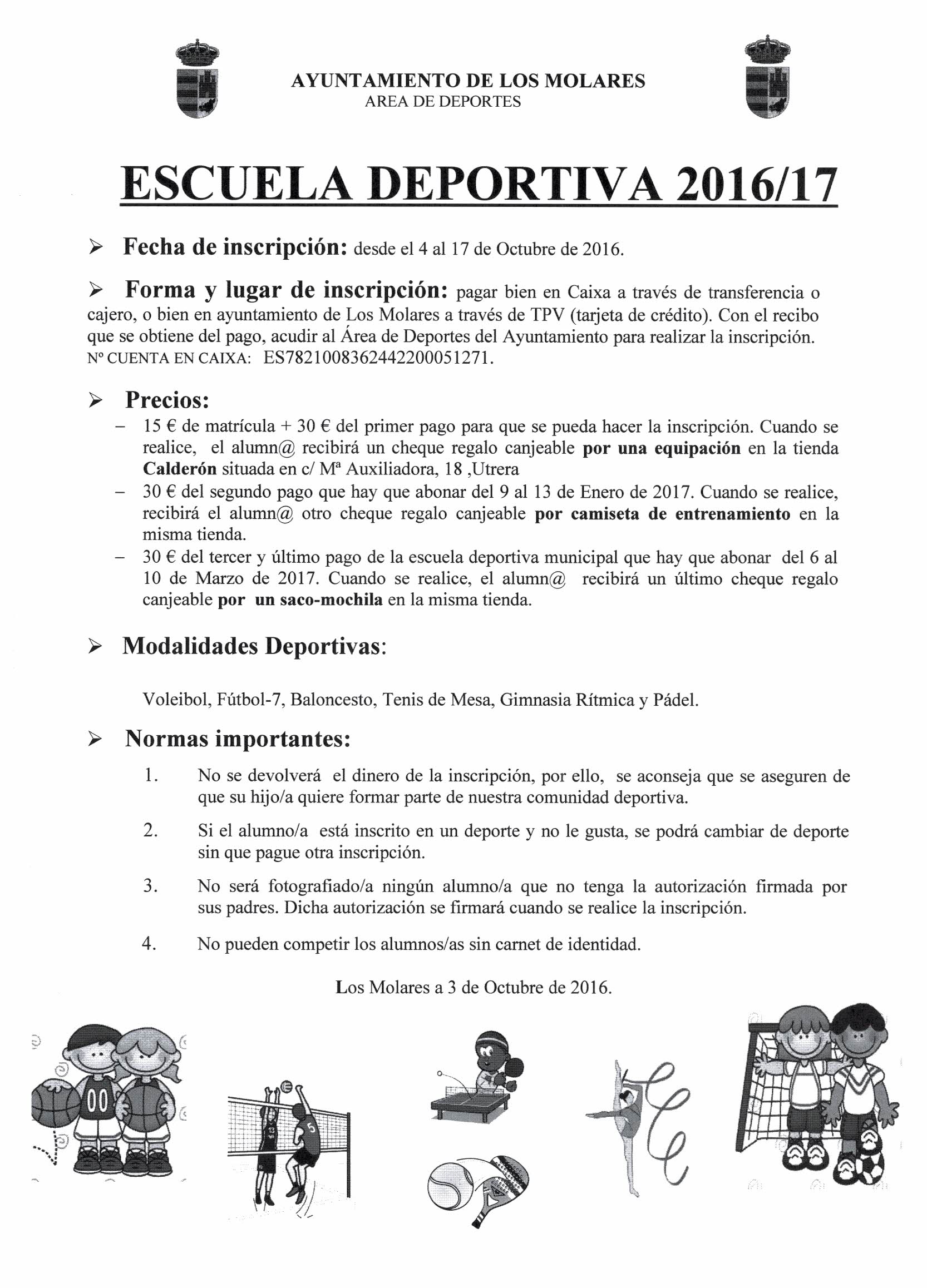 Imagen Ubicación Categoría noticia Deporte Mostrar en el carrusel de la sección No Fecha Lun, 03/10/2016 - 15:00 Más información http://www.losmolares.es/es/actualidad/noticias/ESCUELA-DEPORTIVA-2016-2017/