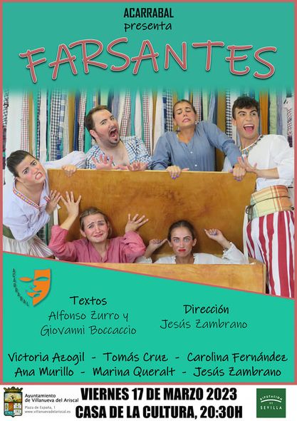 El próximo viernes 17 de marzo a las 20:30h en la Casa de Cultura, La Compañía Acarrabal hará las delicias de los asistentes con su espectáculo "Farsantes". Una comedia en clave de farsa a partir de textos de Alfonso Zurro y Giovanni Boccacci para no parar de reír. No os lo perdáis. Entrada gratuita hasta completar aforo.