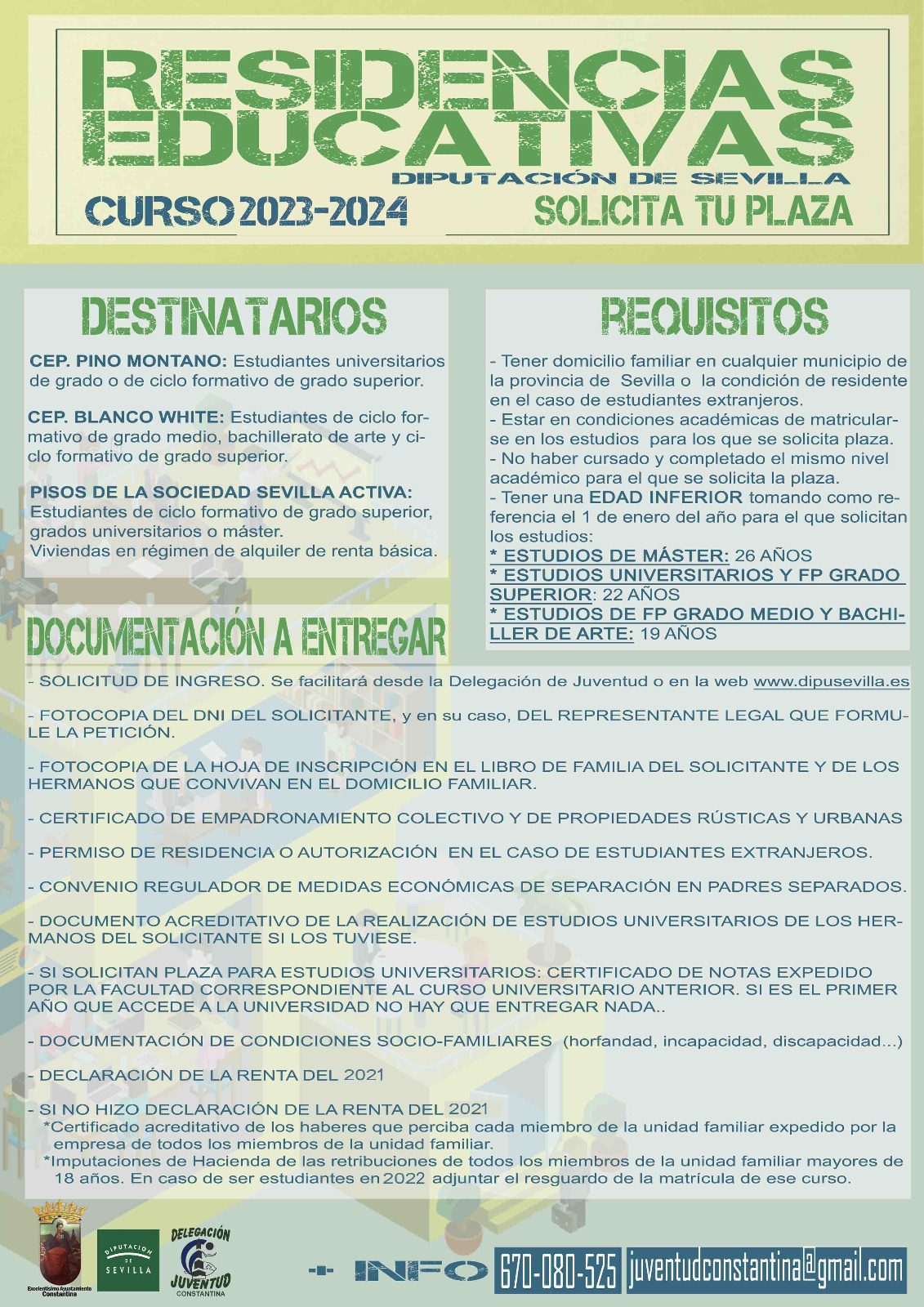 Nuestra Delegación de Juventud nos informa de que la Diputación Provincial de Sevilla ha abierto el plazo para la solicitud de las plazas en Residencias Educativas para el curso escolar 2023/2024. Si eres estudiante y el año que viene vas a cursar estudios en Sevilla puedes optar a una plaza en una de las siguientes: