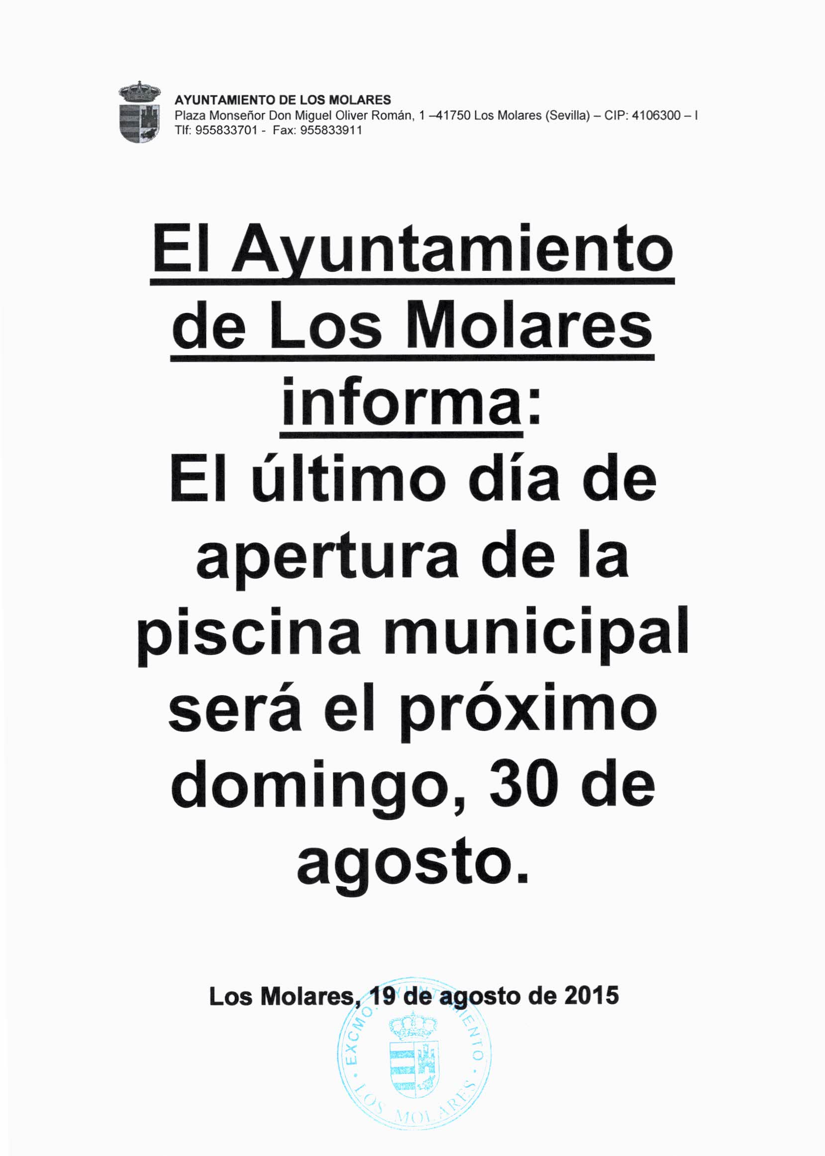 Imagen Ubicación Categoría noticia Deporte Mostrar en el carrusel de la sección No Fecha Jue, 27/08/2015 - 12:46 Más información http://www.losmolares.es/es/actualidad/noticias/Ultimo-dia-de-apertura-de-la-Pi…
