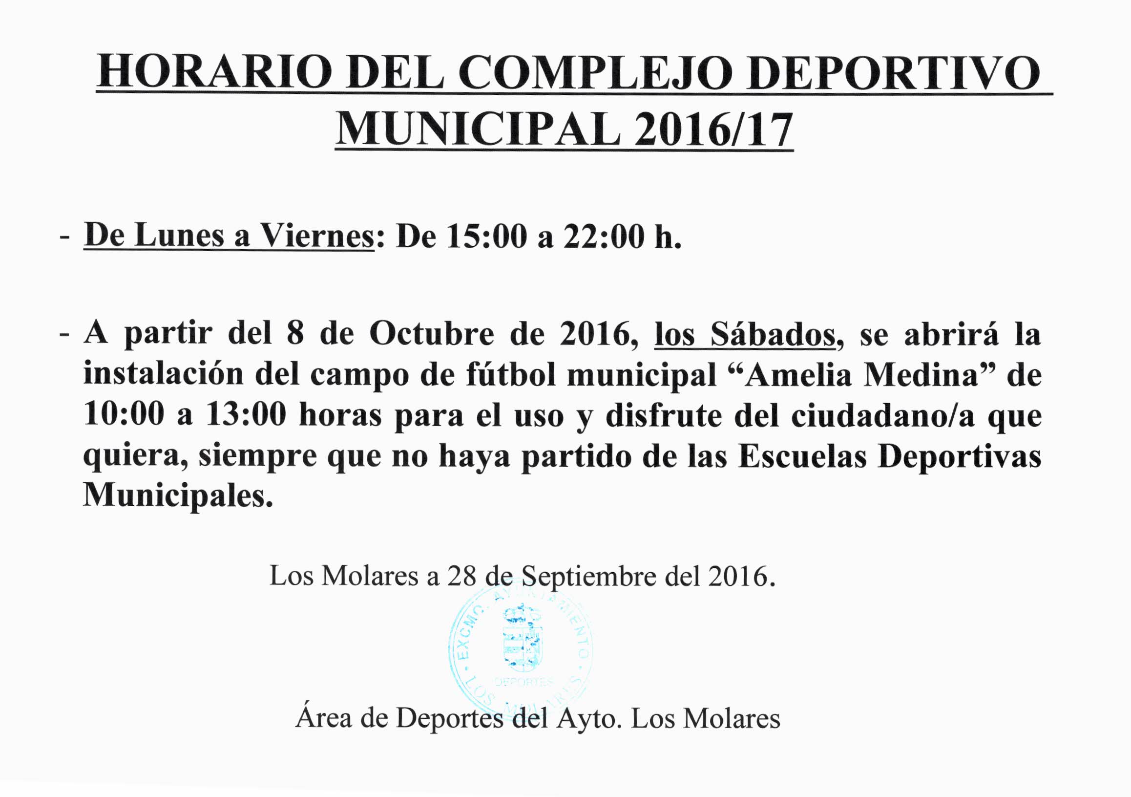 Imagen Ubicación Categoría noticia Deporte Mostrar en el carrusel de la sección No Fecha Mié, 28/09/2016 - 13:42 Más información http://www.losmolares.es/es/actualidad/noticias/NUEVO-HORARIO-DEL-COMPLEJO-DEPO…