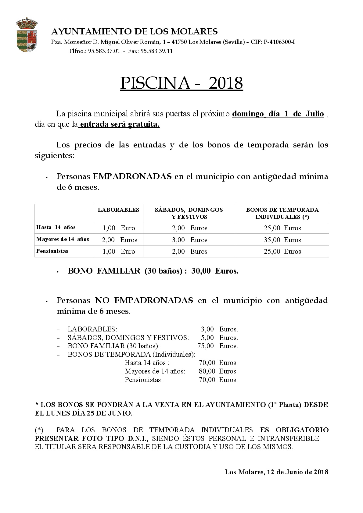 Por la presente se pone en conocimiento de los vecinos interesados la fecha de apertura de la piscina municipal con indicación de los precios establecidos para la temporada de verano 2018.