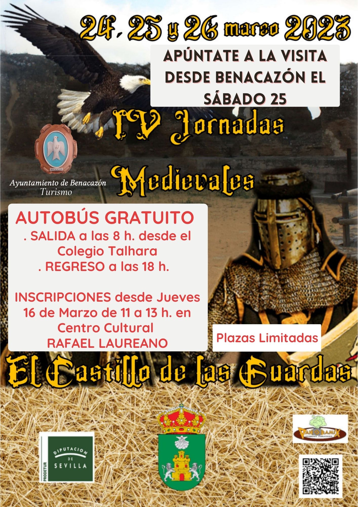 El Ayuntamiento de Benacazón, a través del área de Turismo, informa sobre la VISITA GRATUITA a las "JORNADAS MEDIEVALES DEL CASTILLO DE LAS GUARDAS" (del 24 al 26 de marzo), que realizaremos el próximo Sábado 25 de marzo para conocer la cuarta edición de esta Feria Medieval organizada en dicha localidad.