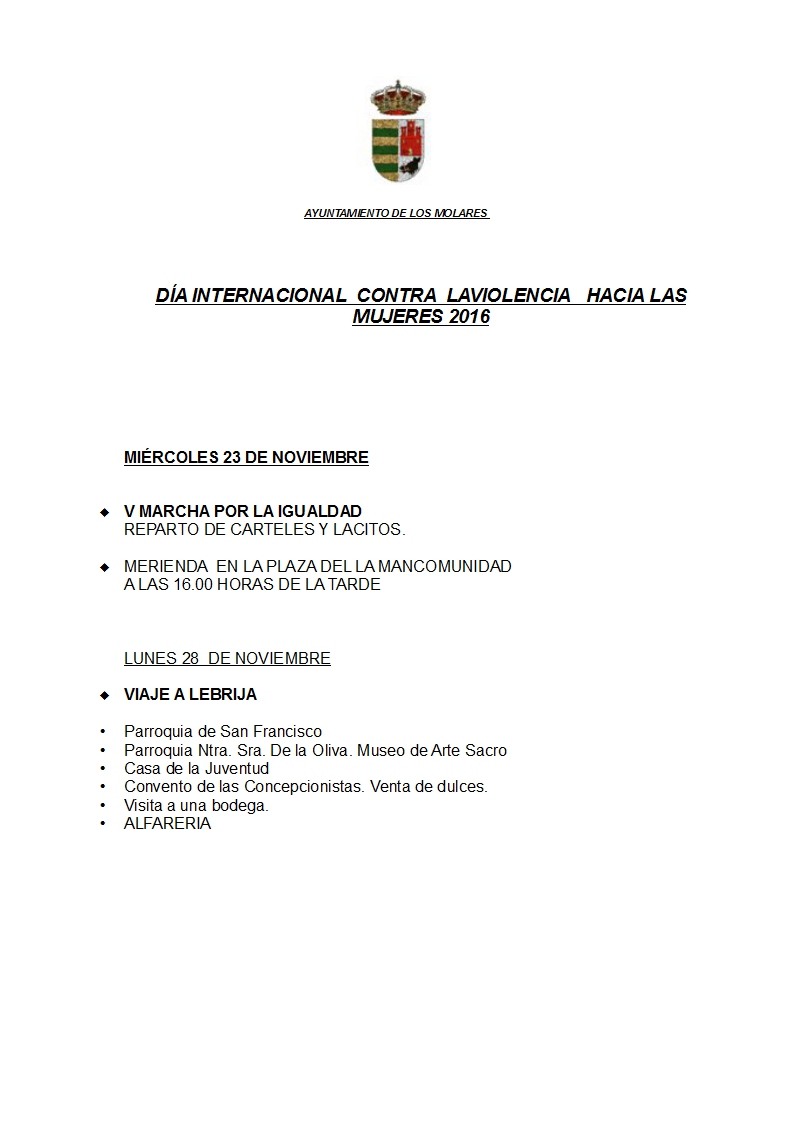 Imagen Ubicación Categoría noticia Igualdad Mostrar en el carrusel de la sección No Fecha Mar, 22/11/2016 - 08:32 Más información http://www.losmolares.es/es/actualidad/noticias/Actividades-Dia-Internacional-c…