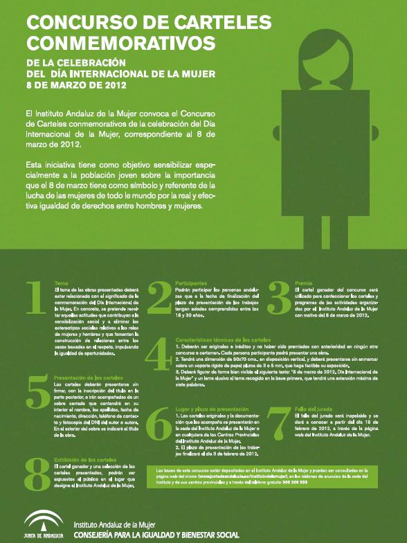 El Instituto Andaluz de la Mujer ha decidido que para la elección de la imagen de la campaña del próximo 8 de Marzo de 2012, se convoque un concurso de carteles, en el que podrá participar la ciudadanía andaluza que tenga entre 18 y 30 años.