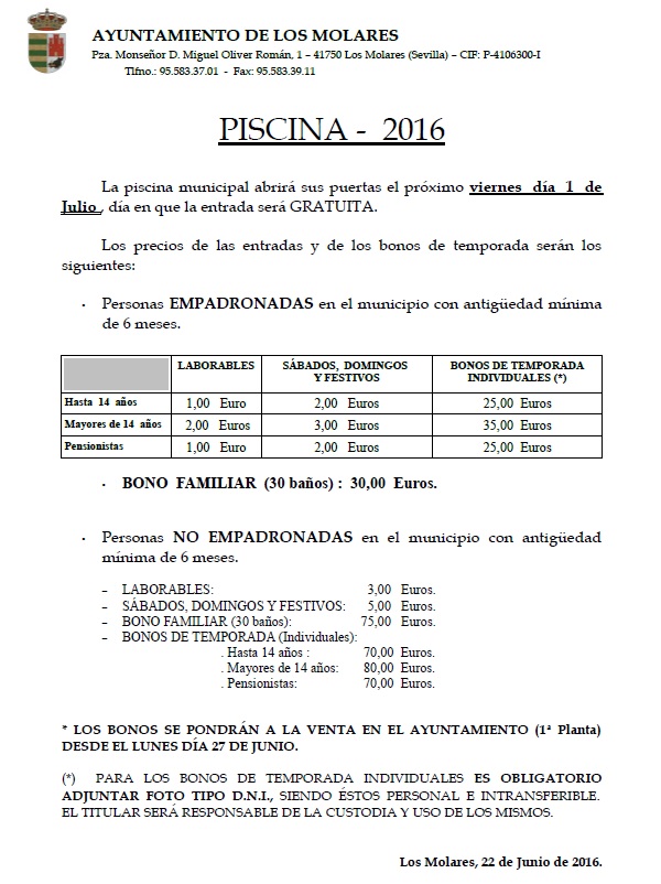 Imagen Ubicación Categoría noticia Deporte Mostrar en el carrusel de la sección No Fecha Mié, 22/06/2016 - 14:18 Más información http://www.losmolares.es/es/actualidad/noticias/PISCINA-MUNICIPAL-2016/