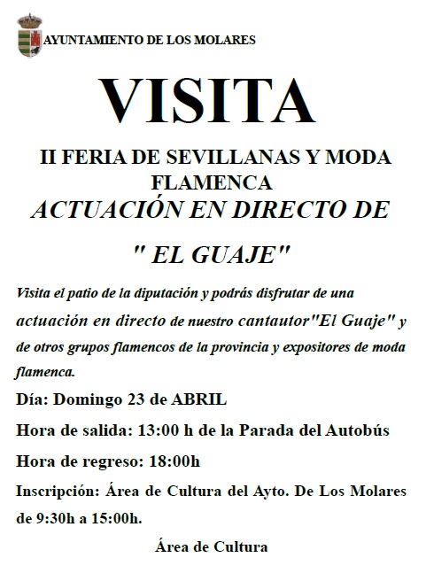 Imagen Ubicación Categoría noticia Cultura Mostrar en el carrusel de la sección No Fecha Mié, 19/04/2017 - 08:20 Más información http://www.losmolares.es/es/actualidad/noticias/VISITA-II-FERIA-DE-SEVILLANAS-Y…