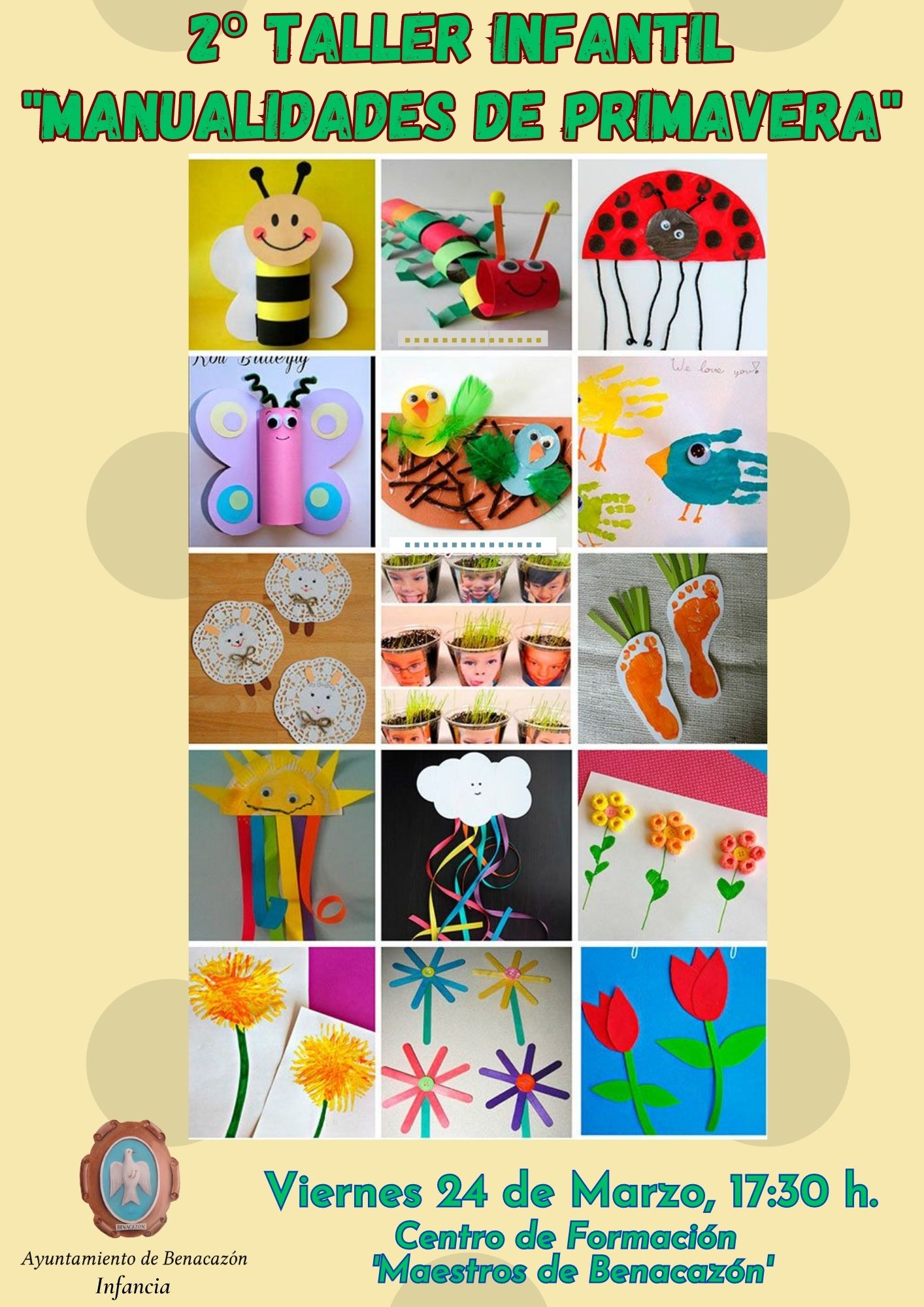 Nuevamente será este viernes, 24 de marzo a las 17:30 h., en el Centro de Formación "Maestros de Benacazón", donde los más pequeños realizarán entretenidas manualidades primaverales, a la vez que juegan con lo más característico de esta nueva estación: las flores, insectos y el sol como protagonistas.