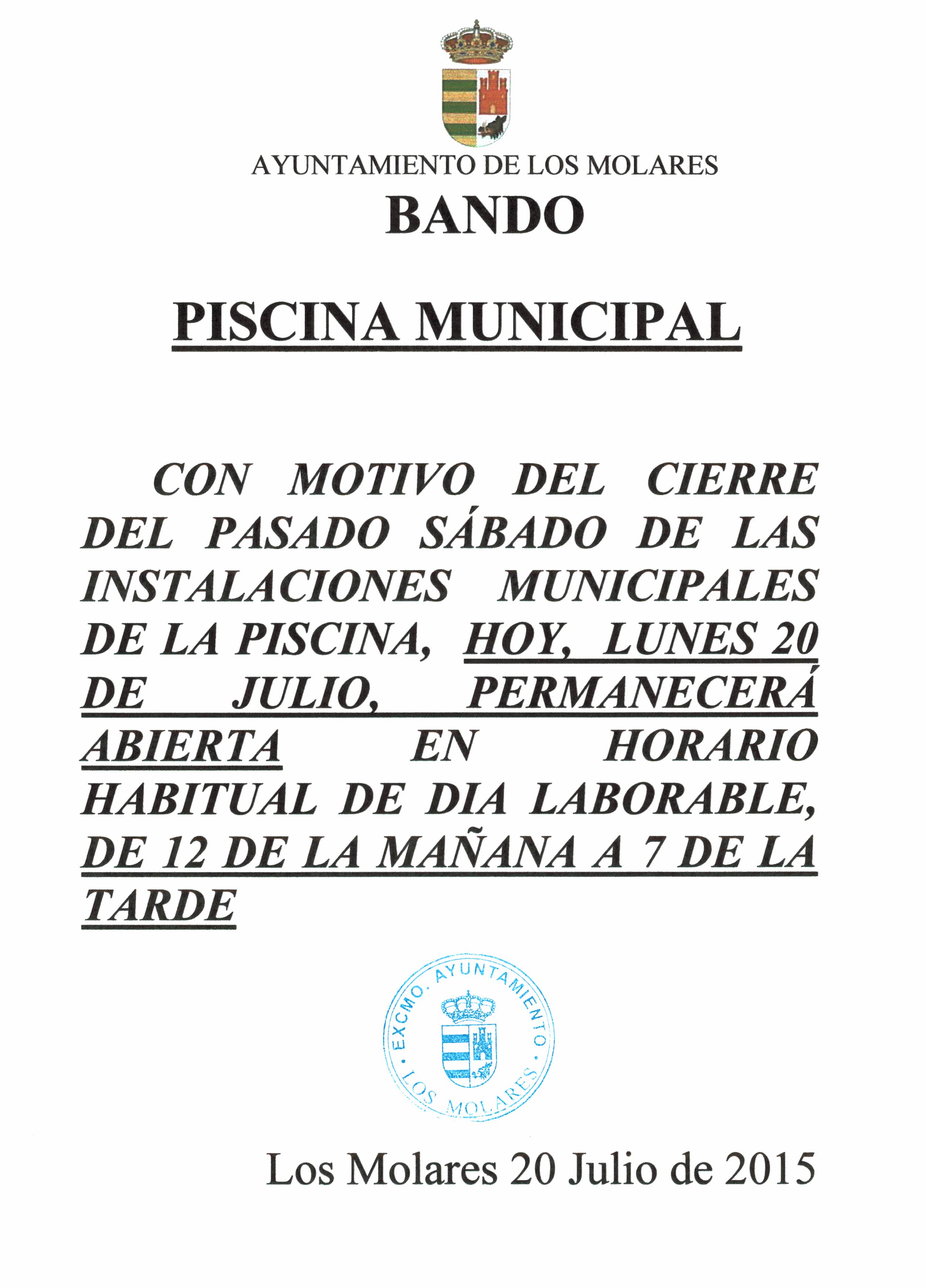 Imagen Ubicación Categoría noticia Deporte Mostrar en el carrusel de la sección No Fecha Lun, 20/07/2015 - 09:19 Más información http://www.losmolares.es/es/actualidad/noticias/LUNES-20-DE-JULIO-LA-PISCINA-MU…
