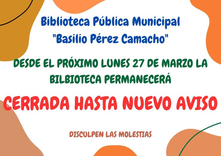 A partir del próximo lunes 27 de marzo la Biblioteca Basilio Pérez Camacho de Cantillana permanecerá cerrada hasta próximo aviso.