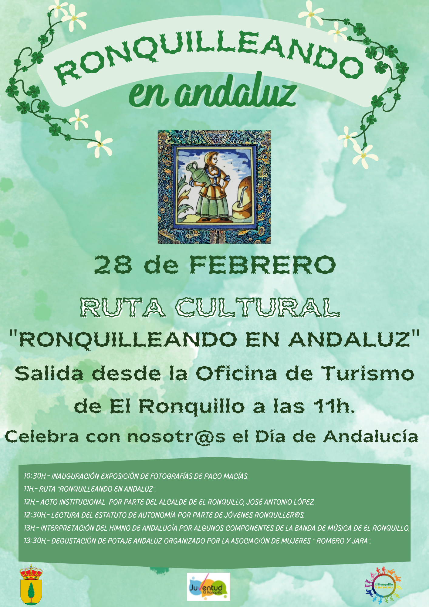 A continuación podrás sumarte al resto de actividades organizadas con motivo del Día de Andalucía: acto institucional, lectura de Estatuto de Andalucía, interpretación del Himno de Andalucía o degustación del potaje andaluz de la Asociación de Mujeres Romero y Jara.