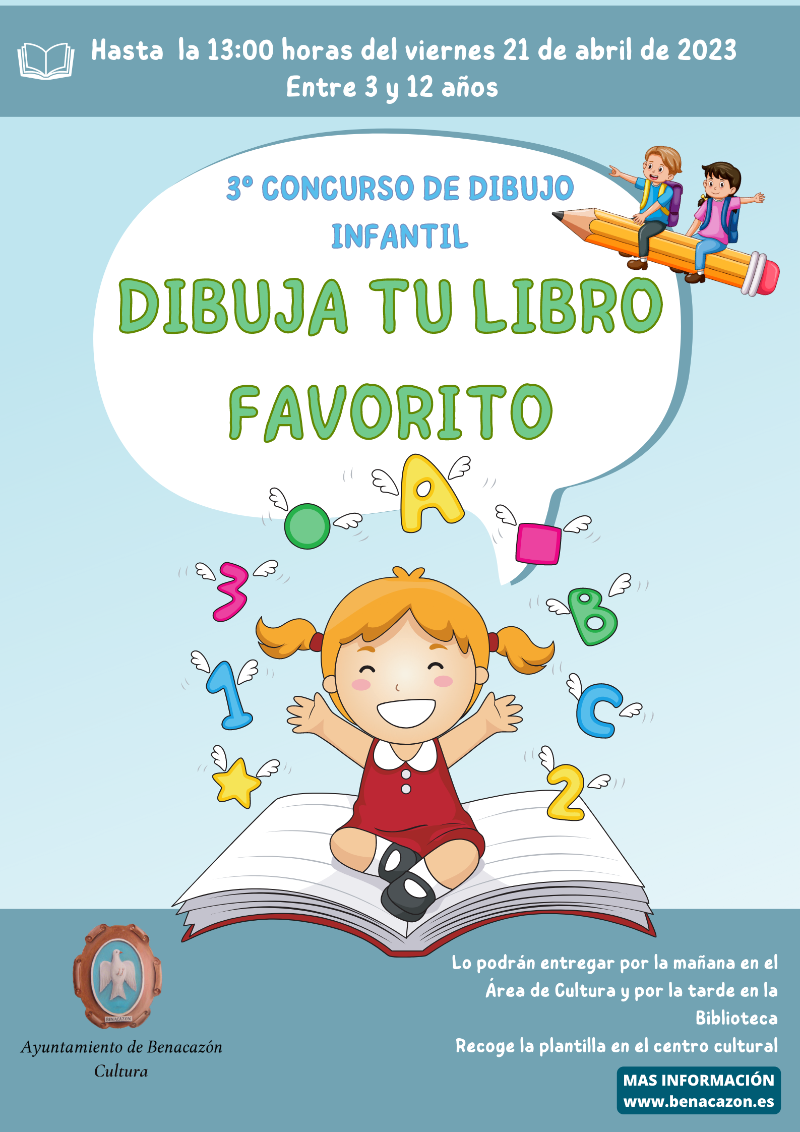 El Ayuntamiento de Benacazón informa sobre el III CONCURSO DE DIBUJO INFANTIL "DIBUJA TU LIBRO FAVORITO", en el que pueden participar niñ@s de entre 3 y 12 años. Actividad incluida en la Semana del Libro 2023, organizada por el Área municipal de Cultura, con el propósito de fomentar el hábito de lectura entre la población y como parte de la Programación de Actividades en la SEMANA DEL LIBRO 2023, que se celebra del 17 al 28 de abril.