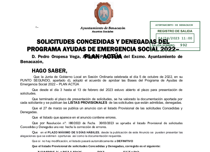 El Ayuntamiento de Benacazón informa, una vez terminado el plazo de presentación de solicitudes para el Programa de Ayudas de Emergencia Social 2022-Plan Actúa, se ha valorado la documentación aportada por cada solicitante y se publican las LISTAS PROVISIONALES de las Solicitudes que están Admitidas y Denegadas, publicadas a continuación en documento adjunto.