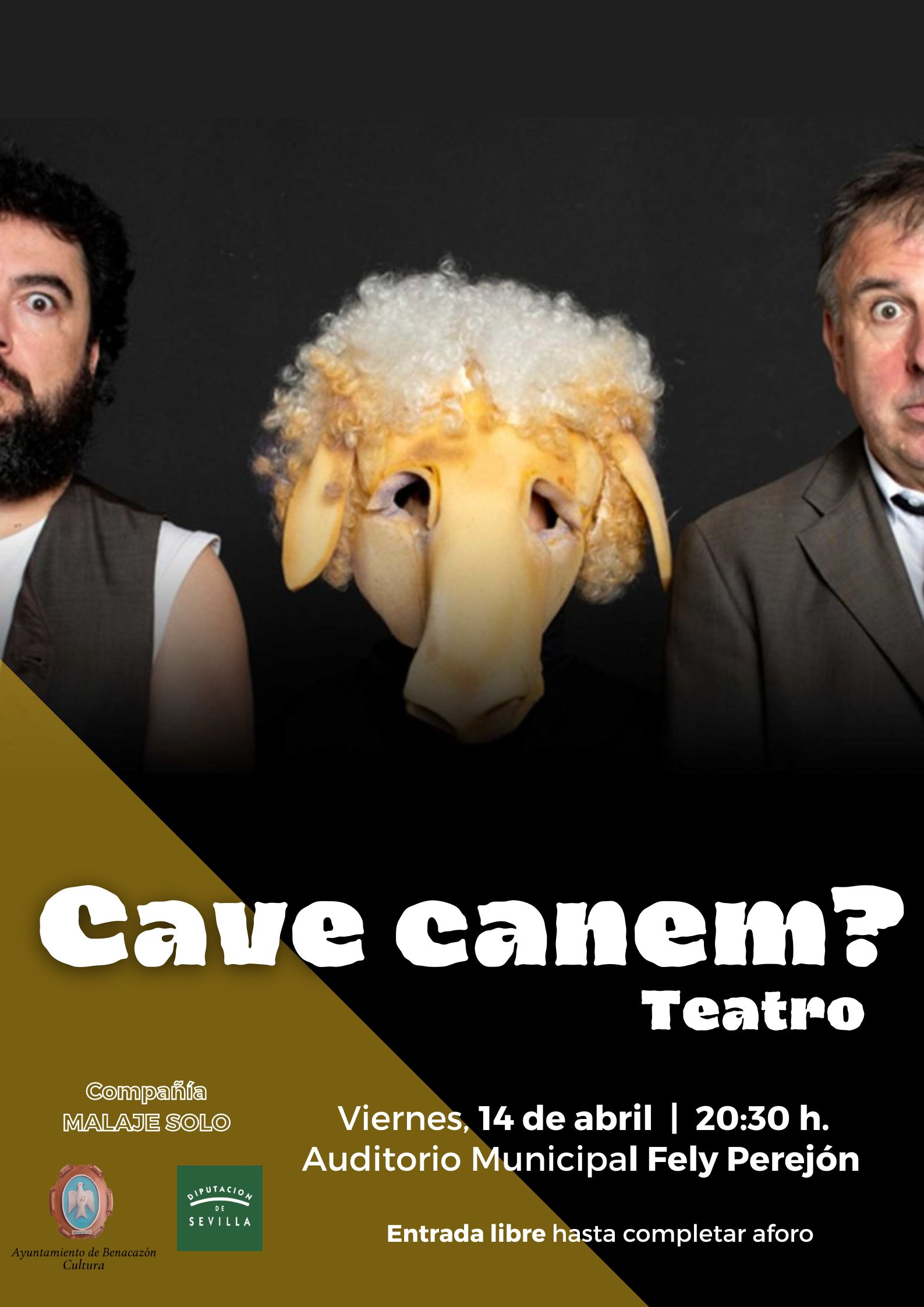 El Ayuntamiento de Benacazón informa sobre una nueva cita teatral con 'CAVE CANEM?', de la compañía Malaje Sólo, que tendrá lugar el viernes 14 de abril en el Auditorio Municipal Fely Perejón. Entrada Libre hasta completar aforo. Una divertida comedia escrita y dirigida por José Antonio Aguilar, e interpretada por el propio Aguilar junto con Antonio Blanco. Actividad organizada por la Delegación Municipal de Cultura, adscrita a la Subvención del Área de Cultura y Ciudadanía de la Diputación de Sevilla, para la realización de actividades culturales municipales. La Delegada del área, Carmen Rocío Bautista, os invita a asistir a esta obra dentro de la Programación Cultural de nuestro municipio, que puedes seguir a través de la web www.benacazon.es y demás redes sociales del Ayuntamiento de Benacazón (Facebook: "Ayuntamiento de Benacazón", Instagram: "ayuntamiento.benacazon" y Twitter: @benacazon).
