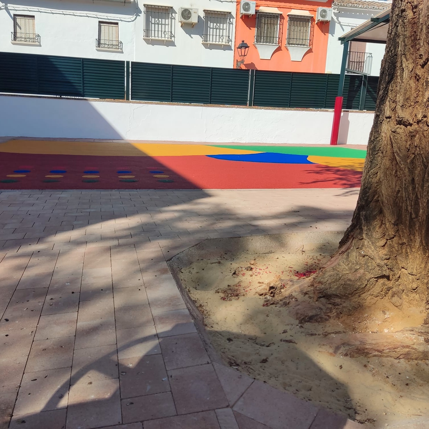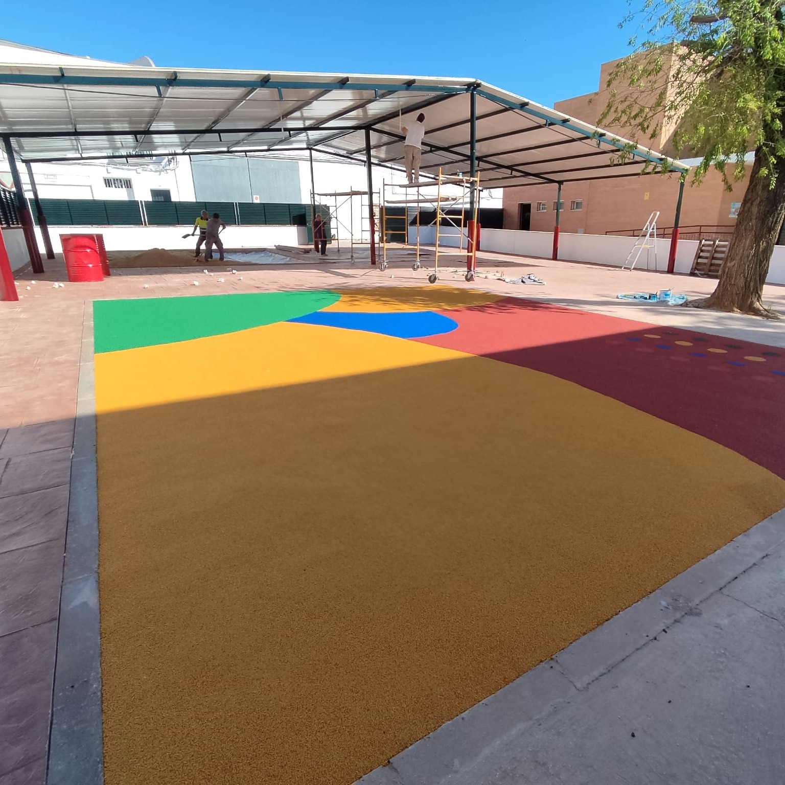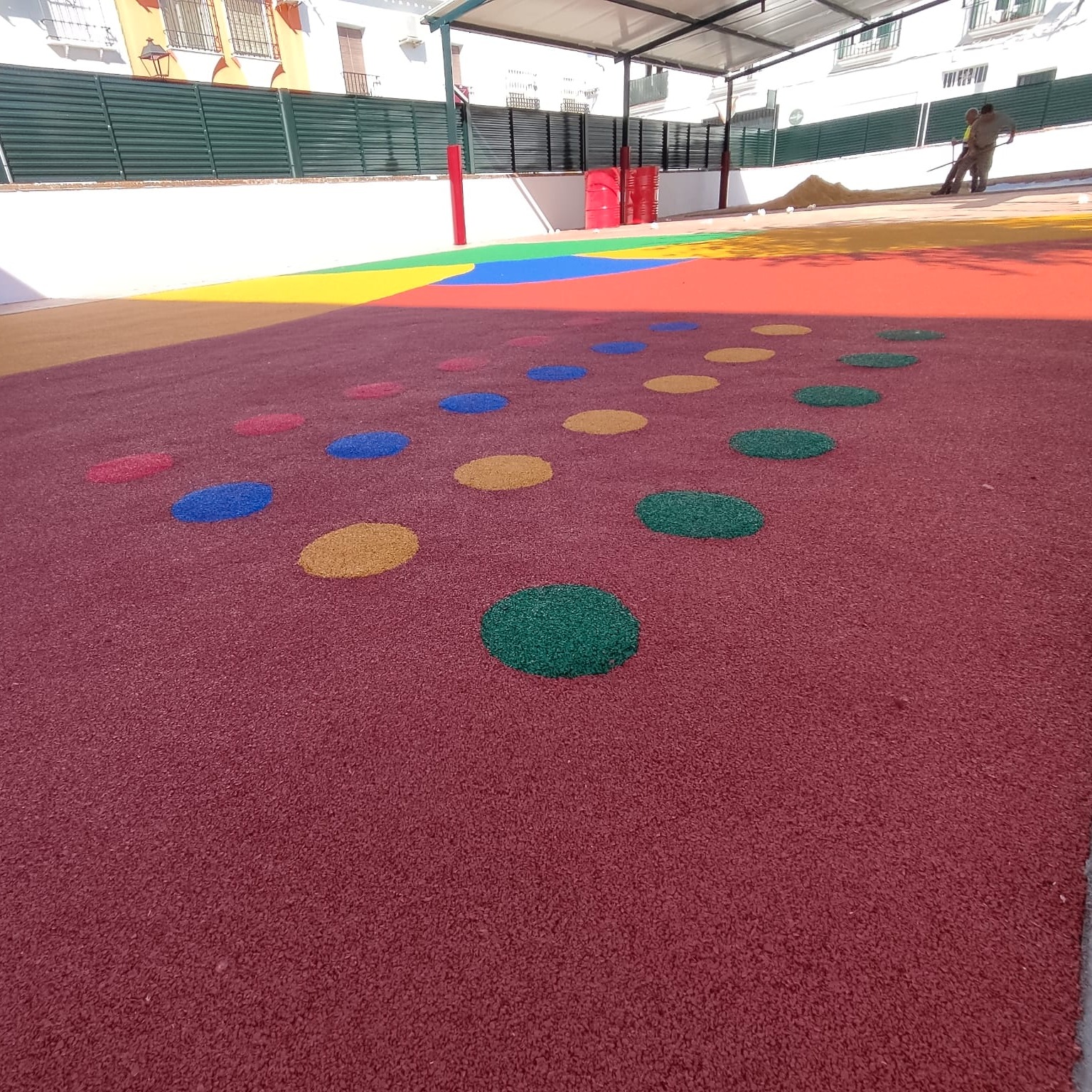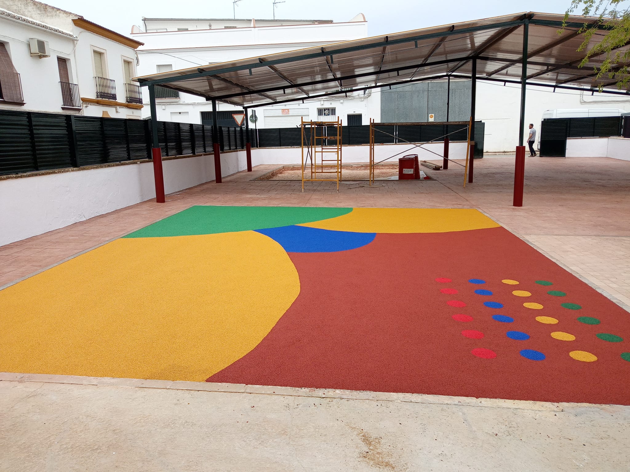 Las obras que se están realizando en el antiguo patio de albero del colegio se llenan de color con la finalización del espacio de caucho y la pintura del vallado y estructura metálica.
