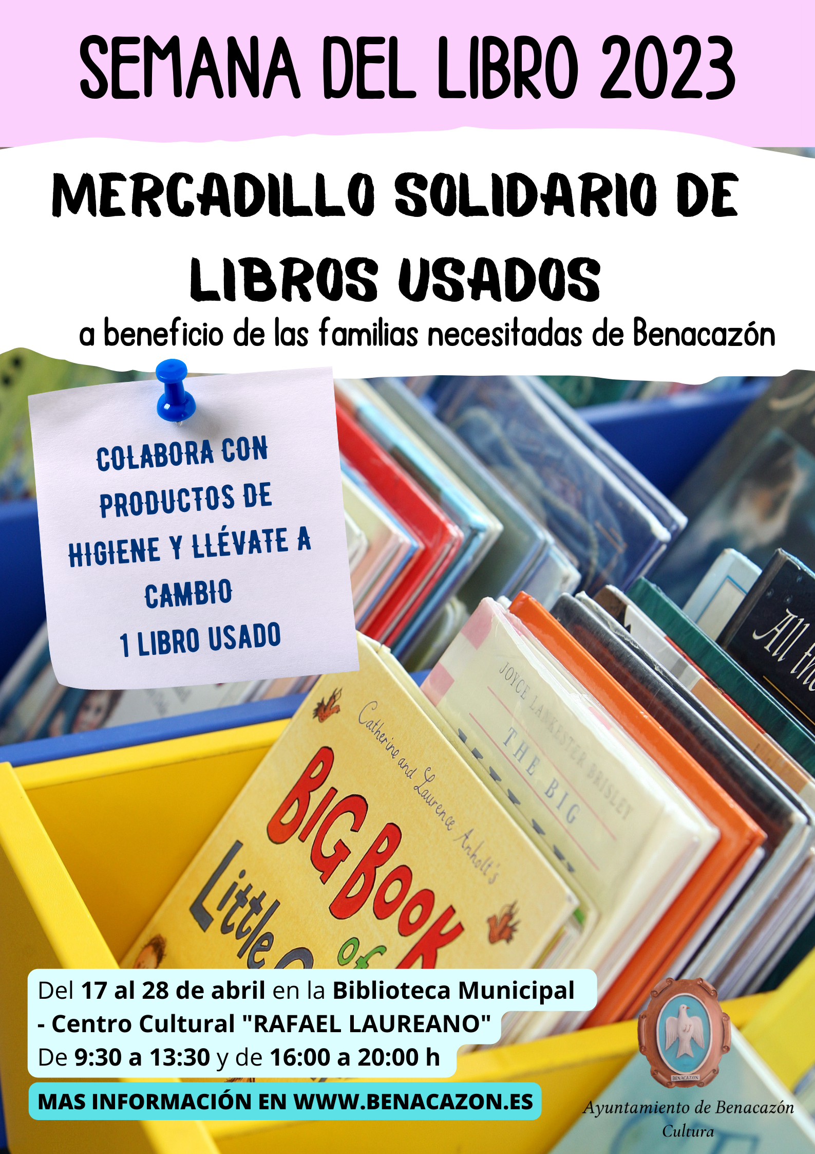 - Del 17 al 28 de abril: MERCADILLO SOLIDARIO DE LIBROS USADOS a beneficio de las familias necesitadas de Benacazón. Donde podrás participar y a la vez ayudar a personas que lo necesitan, porque si traes productos de higiene te llevas a cambio un libro usado, con el objetivo de colaborar solidariamente mientras potenciamos la Lectura.