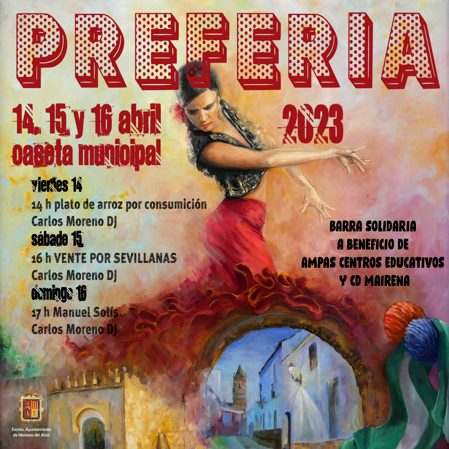 La delegada de Fiestas Mayores, Gloria Guillén, ha presentado esta mañana a puertas de la caseta municipal la Preferia, que este año 2023 se celebrará del 14 al 16 de abril. La barra es solidaria a beneficio de las AMPAS que no tienen caseta y el CD Mairena. El vienes 14 se ofrecerá un plato de arroz por cada consumición.