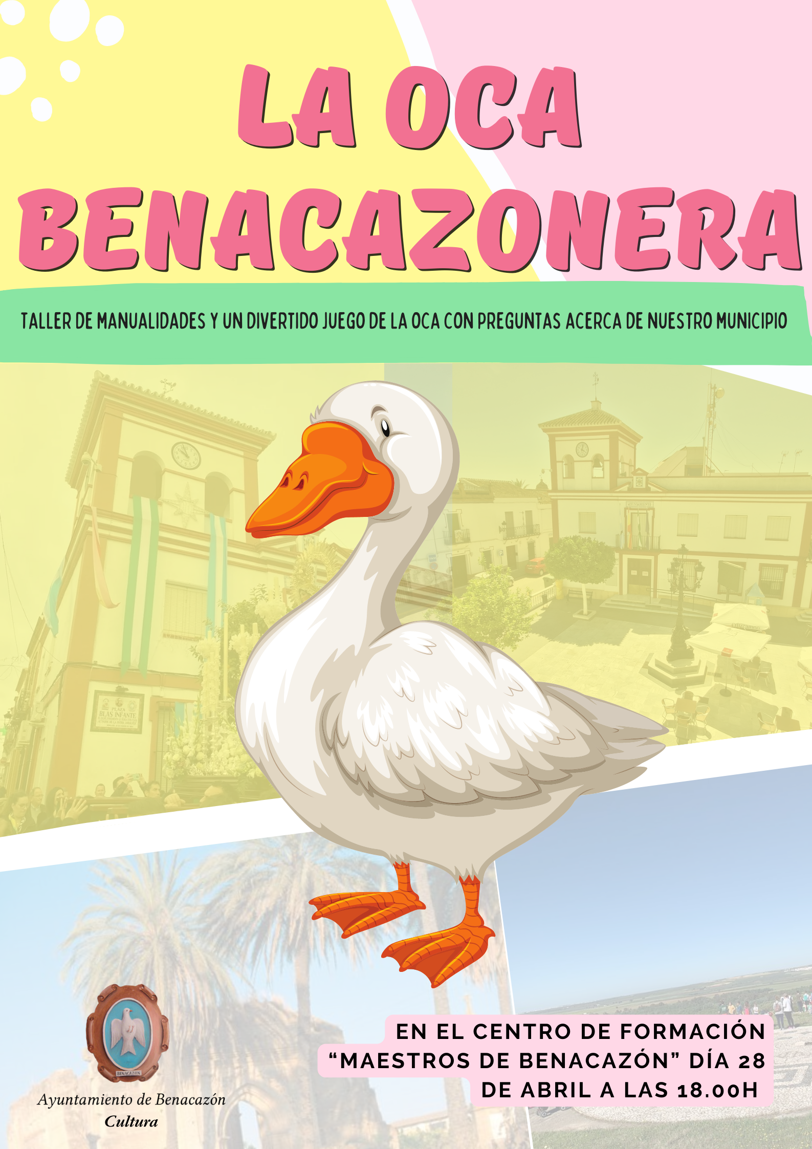 - Viernes 28 de abril: LA OCA BENACAZONERA. Taller de Manualidades y divertido Juego de la Oca con preguntas tematizadas acerca de nuestro municipio. A las 18:00 h. Centro de Formación "Maestros de Benacazón" (C/ Vicente Aleixandre).