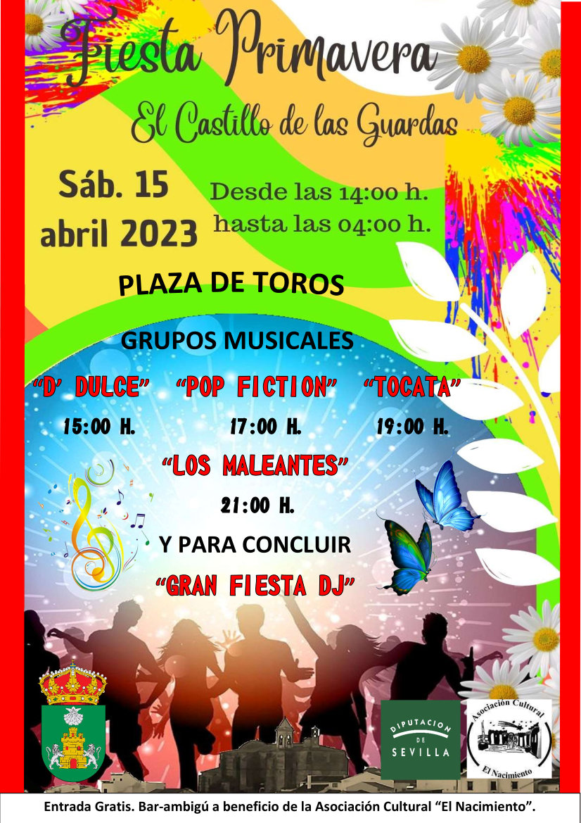 Celebramos nuestra Fiesta de la Primavera, con grandes actuaciones, el próximo sábado 15 de abril 2023 desde las 14:00 h. hasta las 04:00 h. de la madrugada, con entrada gratuita.