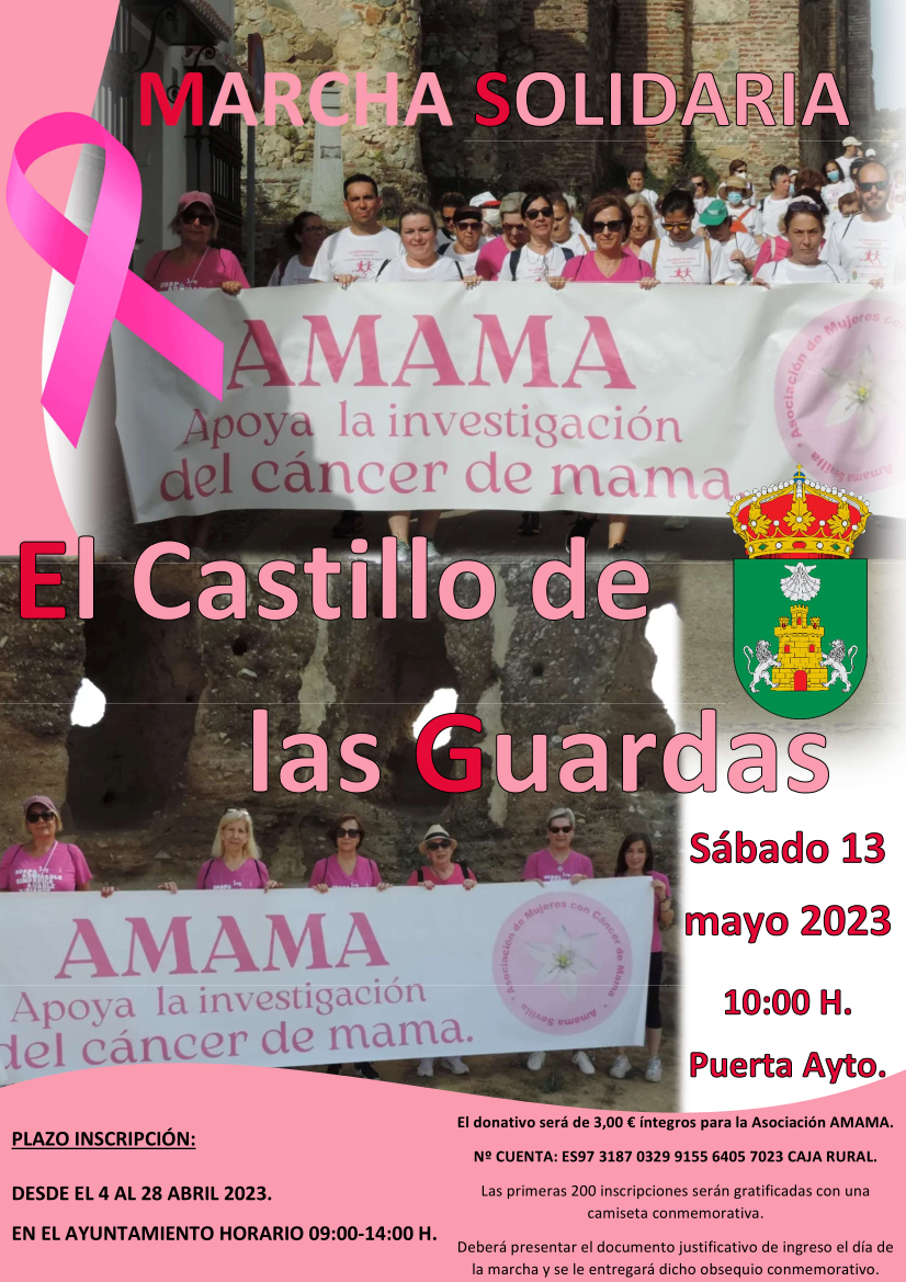 Unete a la marcha solidaria en apoyo a la investigación del cáncer de mama que tendrá lugar en nuestro pueblo el próximo sábado 13 de mayo 2023 a las 10:00 h. en colaboración con la Asociación AMAMA.