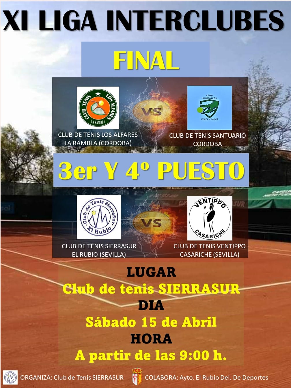El próximo sábado 15 de abril, se disputa en el Club de Tenis Sierrasur de El Rubio la FINAL y el 3º y 4º puesto de la XI edición de de la Liga Interclubes de Tenis.