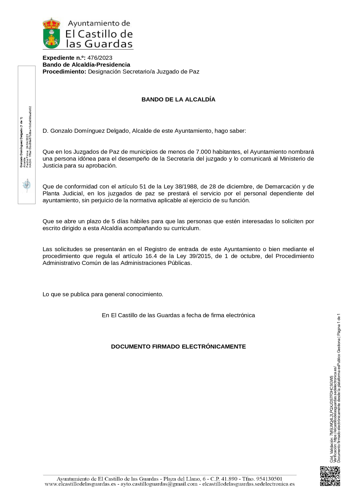 Se informa a todos/as los/as vecinos/as que se abre plazo de solicitudes para optar al desempeño de la Secretaría del juzgado, siendo el plazo de 5 días hábiles.
