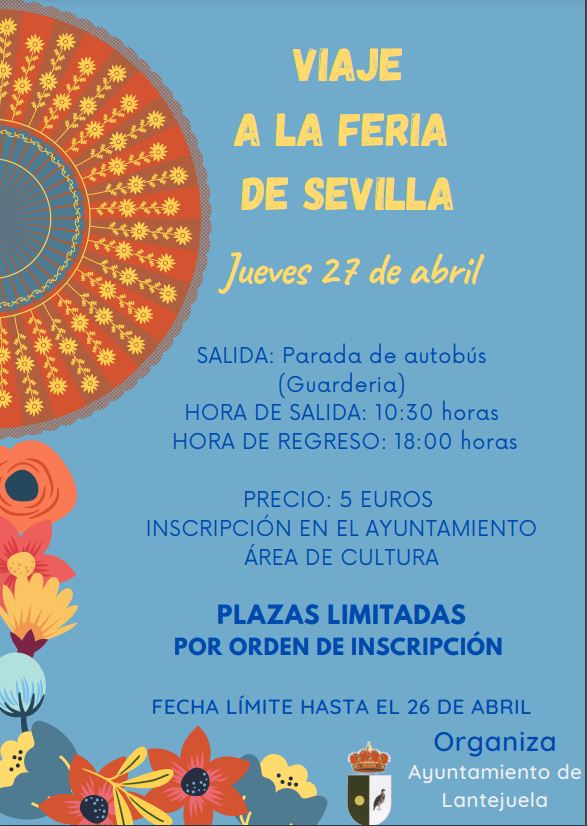 Fecha inicio Mié, 19/04/2023 - 13:14 Fecha fin Jue, 27/04/2023 - 23:14 Imágenes Ubicación Categoría evento Ciudadanía Mostrar en el carrusel de la sección No Más información http://www.lantejuela.org/es/actualidad/eventos/Viaje-a-la-Feria-de-Sevilla-000…