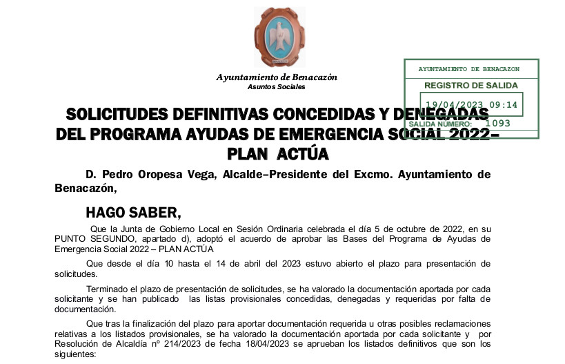 El Ayuntamiento de Benacazón informa que, tras la finalización del plazo para aportar documentación requerida u otras posibles reclamaciones relativas a los listados provisionales, se ha valorado la documentación aportada por cada solicitante y por Resolución de Alcaldía nº 214/2023 de fecha 18/04/2023 se aprueban los listados definitivos que son los siguientes: