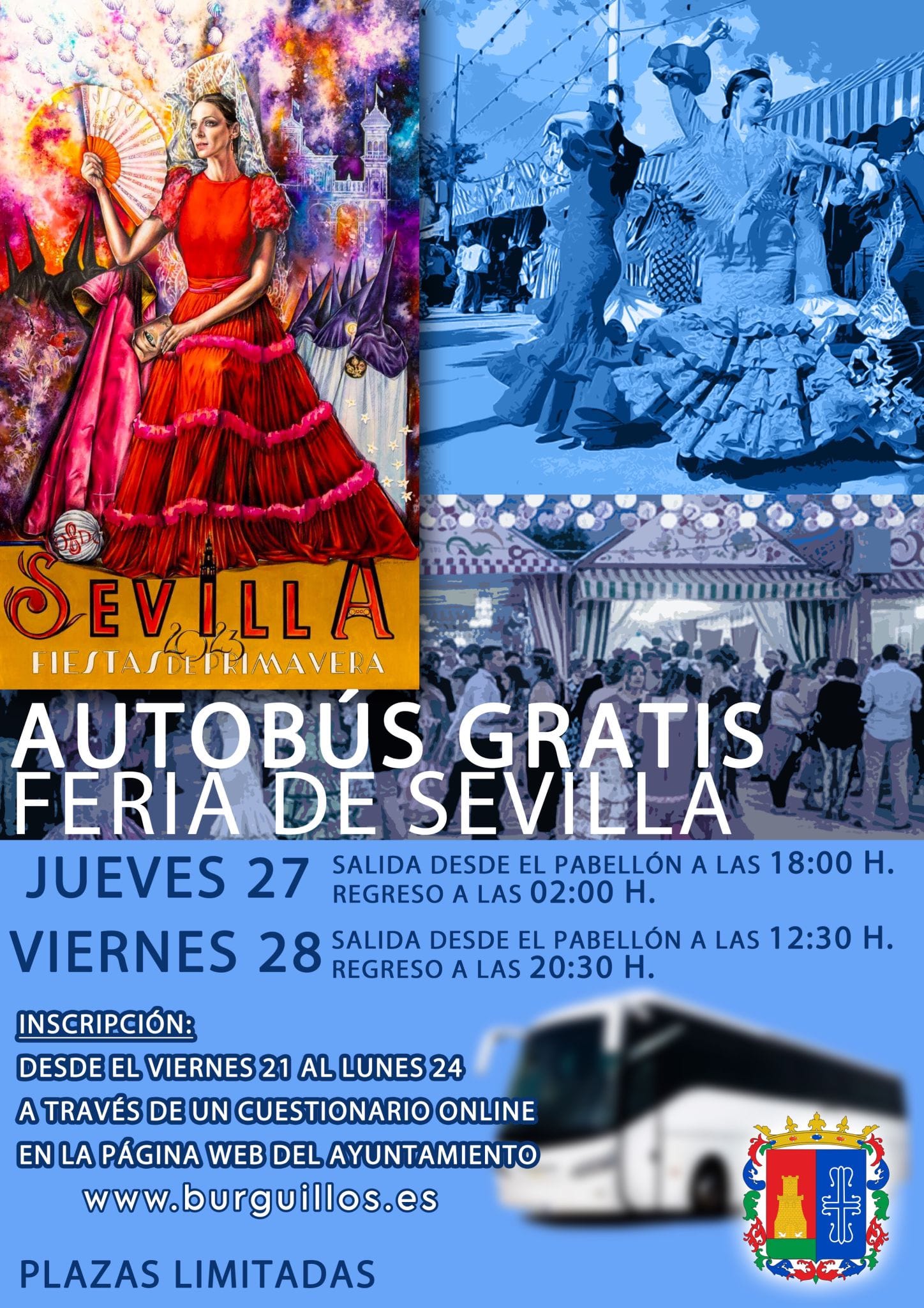 El Ayuntamiento de Burguillos pondrá a disposición de los burguilleros dos autobuses para que nuestros vecinos disfruten de la Feria de Sevilla. Uno de ellos será el jueves 27 de abril con salida a las seis de la tarde y vuelta a las dos de la mañana y el siguiente será el viernes 28 con salida a las 12:30 de la mañana y vuelta a las 20:30 horas.