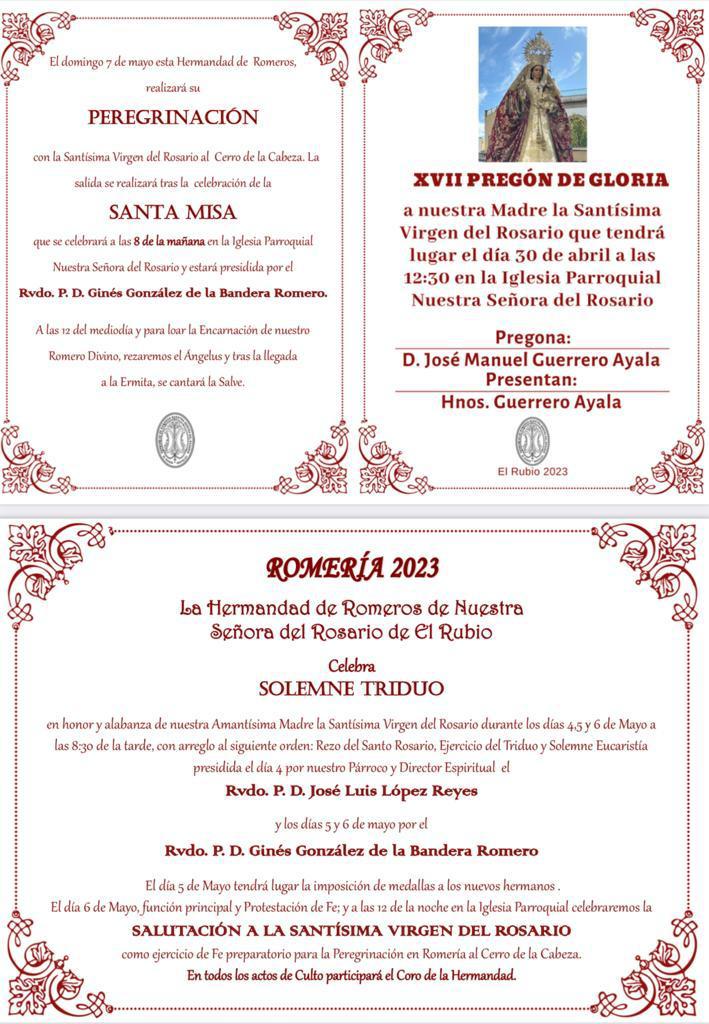 Fecha inicio Jue, 04/05/2023 - 09:43 Fecha fin Sáb, 06/05/2023 - 09:43 Imágenes Ubicación Categoría evento Ciudadanía Mostrar en el carrusel de la sección No Más información http://www.elrubio.es/es/actualidad/eventos/TRIDUO-DE-LA-VIRGEN-DEL-ROSARIO.-EL…