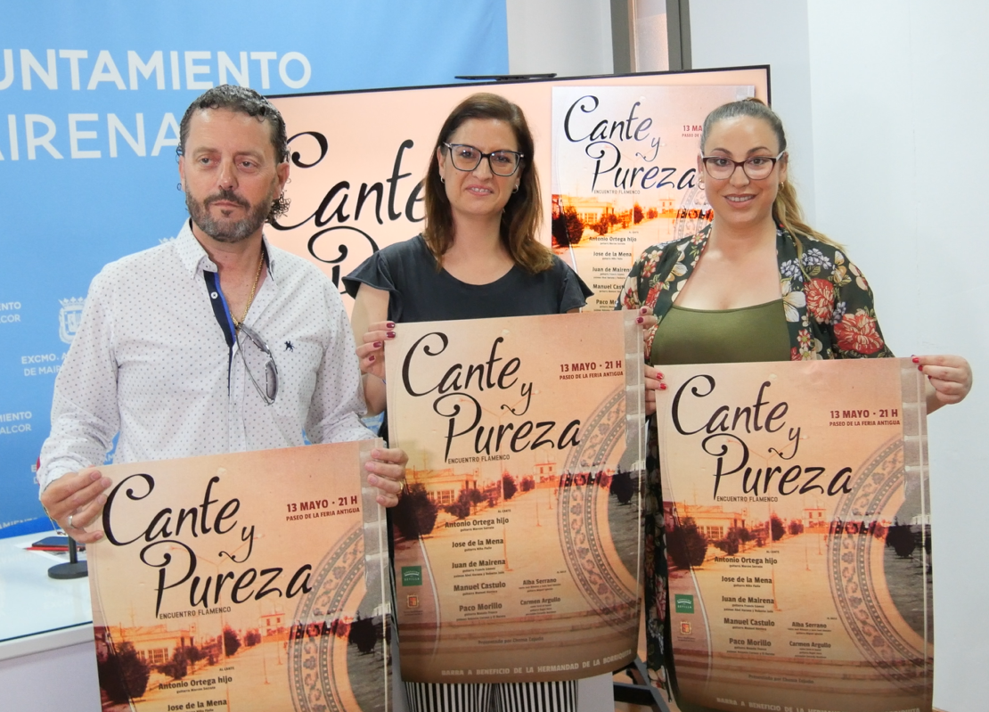 La delegada de Flamenco, Gloria Guillén, acompañada por la bailaora Alba Serrano y el cantaor Antonio Ortega hijo han presentado hoy el encuentro flamenco Cante y Pureza, subvencionado por el Área de Cultura y Ciudadanía de la Diputación de Sevilla en el marco de la realización de actividades culturales municipales, que tendrá lugar el 13 de mayo en el paseo de la Feria Antigua a las 21 horas.