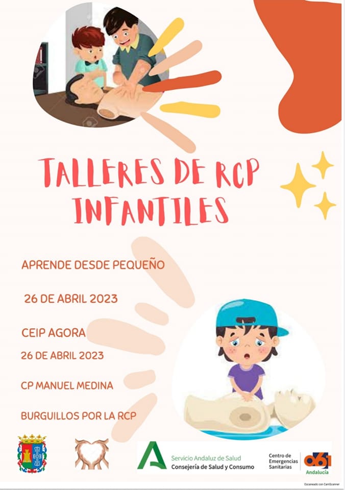 Mañana miércoles, día 26 de abril, se realizarán unos talleres de reanimación cardio pulmonar y soporte vital básico con los alumnos de los colegios #ManuelMedina y #Ágora. Dichos talleres serán impartidos por técnicos de emergencia del 061 dirigidos por nuestro paisano Luis Murillo.