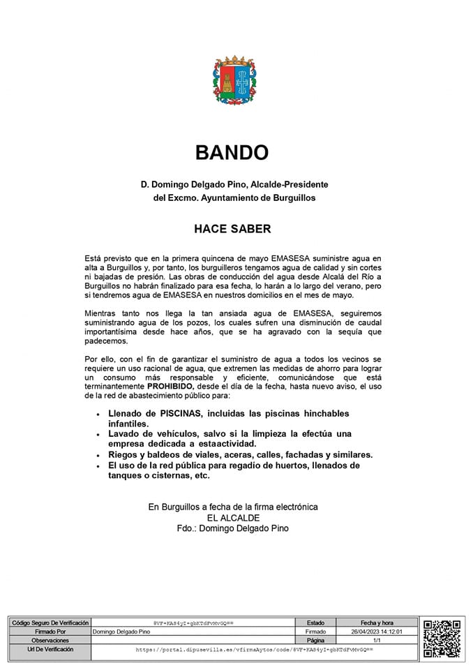 Está previsto que en la primera quincena de mayo EMASESA suministre agua en alta a Burguillos y, por tanto, los burguilleros tengamos agua de calidad y sin cortes ni bajadas de presión. Las obras de conducción del agua desde Alcalá del Río a Burguillos no habrán finalizado para esa fecha, lo harán a lo largo del verano, pero si tendremos agua de EMASESA en nuestros domicilios en el mes de mayo.